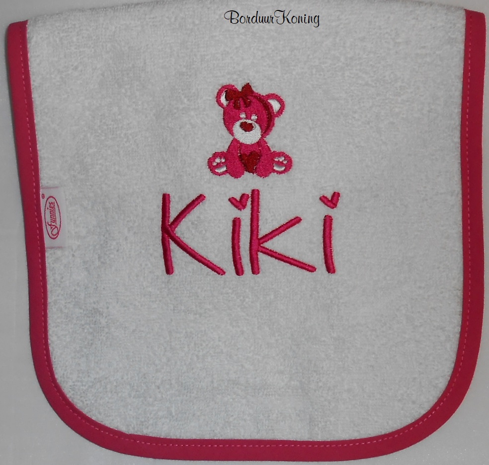 Setjes baby textiel, bestaande uit een badcape en een slabber, zijn verkrijgbaar in 4 kleuren: Ecru, Fuchsia, Turquoise en Wit
