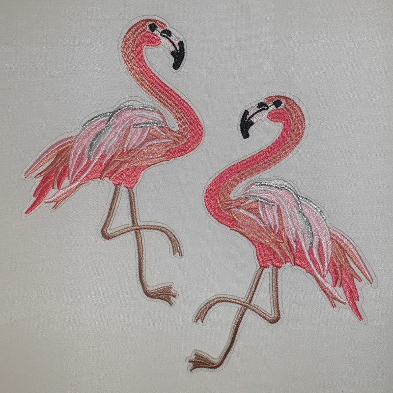Applicaties flamingo's 2 stuks roze tinten geborduurd.