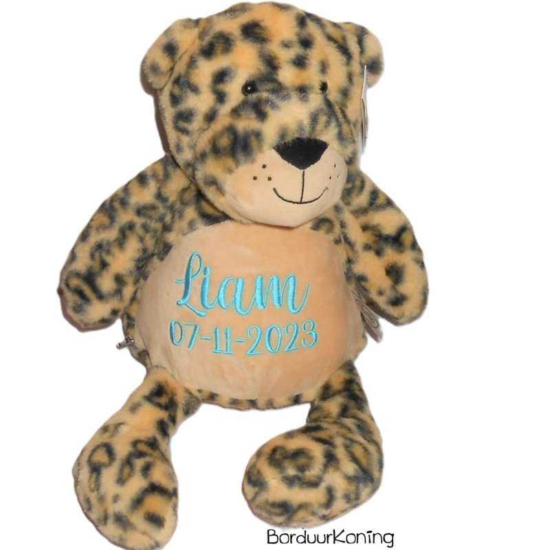Luipaard knuffel wordt op de buik gepersonaliseerd