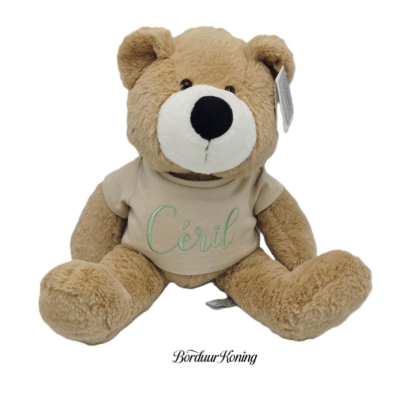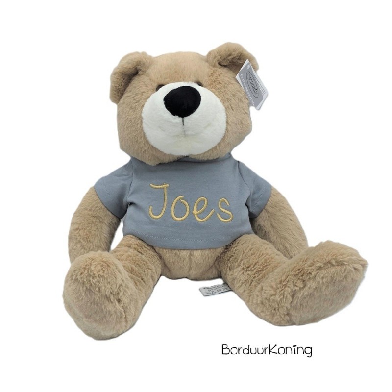 Knuffel word geborduurd op het T-shirtje.