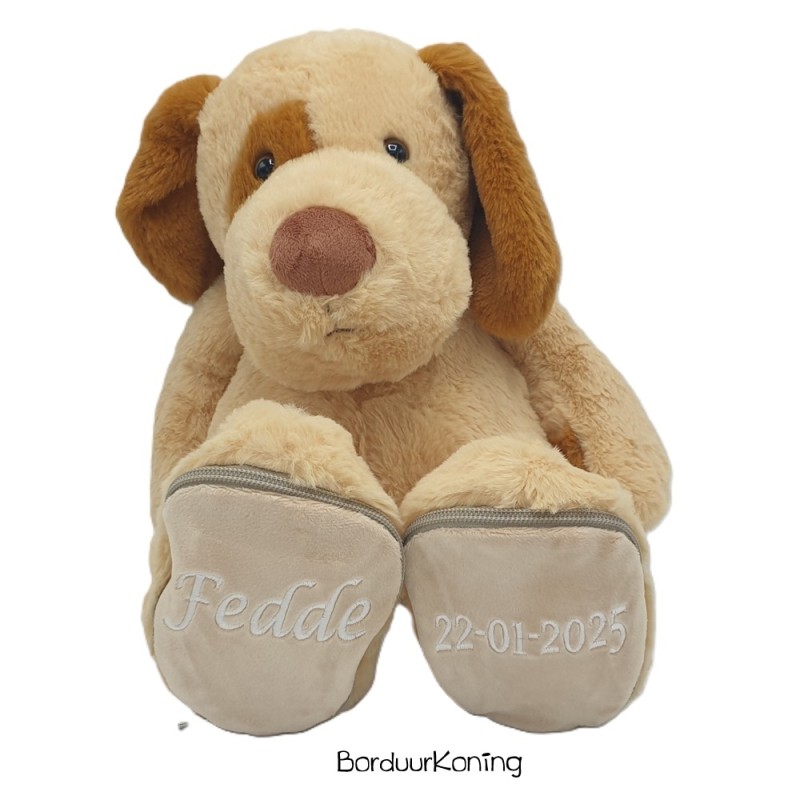 Knuffel hond met voetjes de eraf kunnen die gepersonaliseerd kunnen worden.