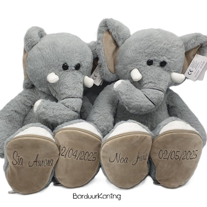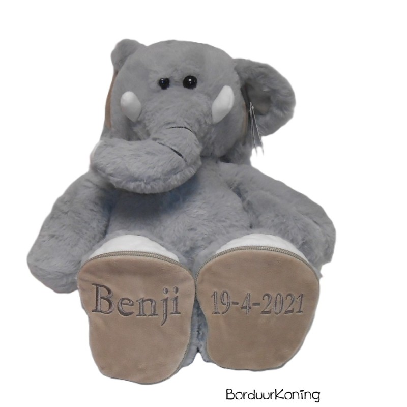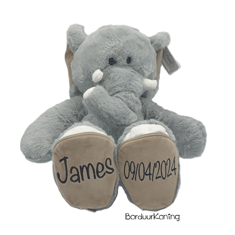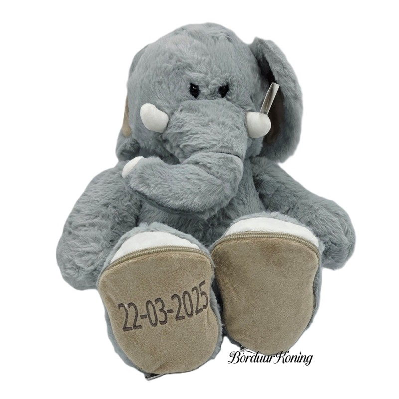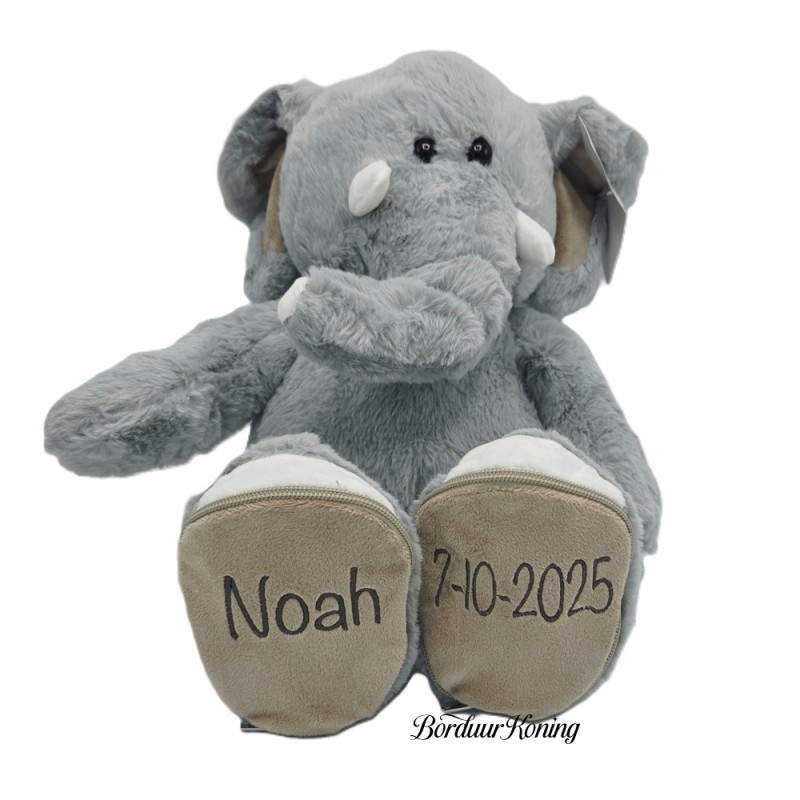 Hij heeft grijze/taupe voetjes waar op geborduurd kan worden.
