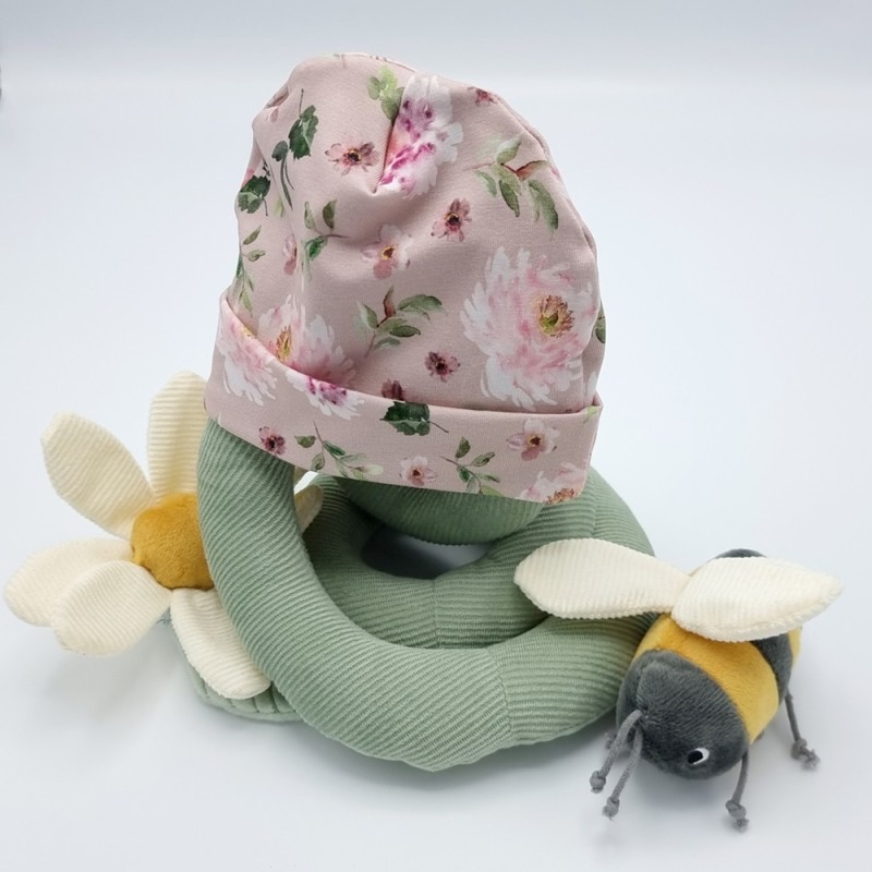 Babymuts roze met gekleurde bloemen losse verkoop of met naam borduren.