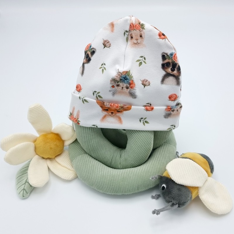 Babymuts wit met een dieren print losse verkoop of met naam borduren.