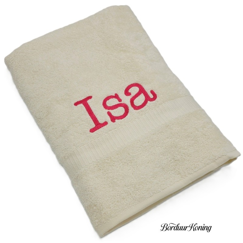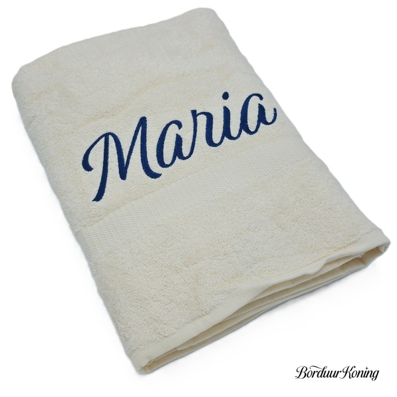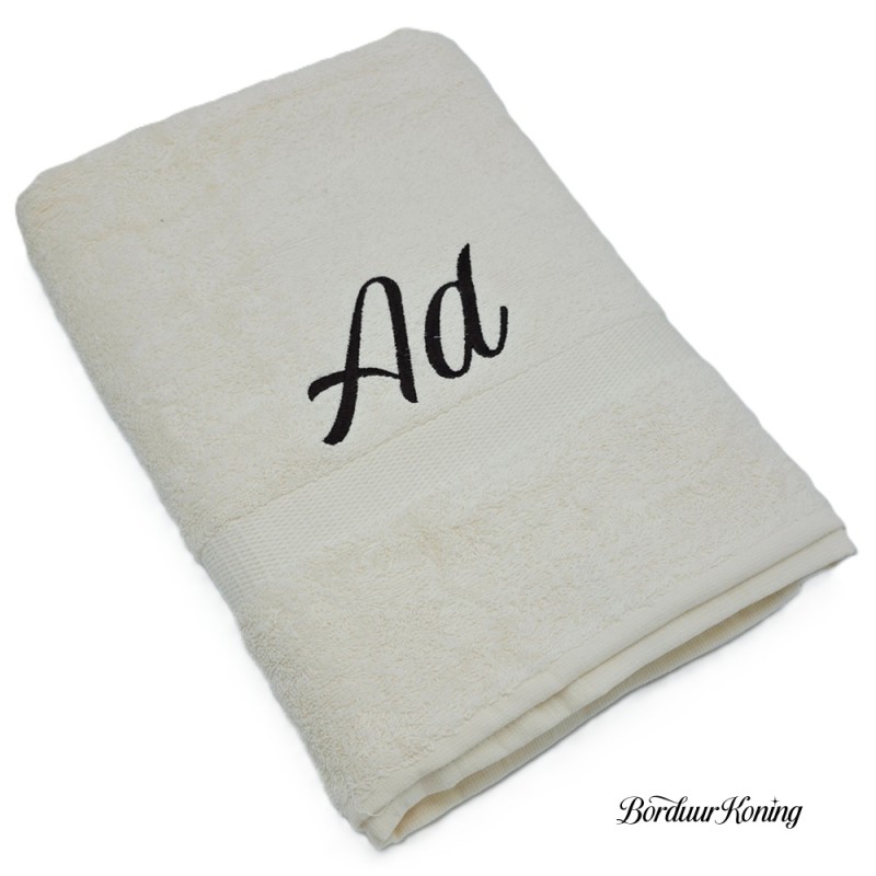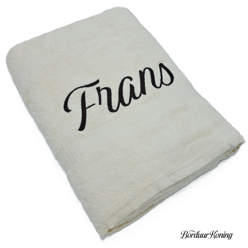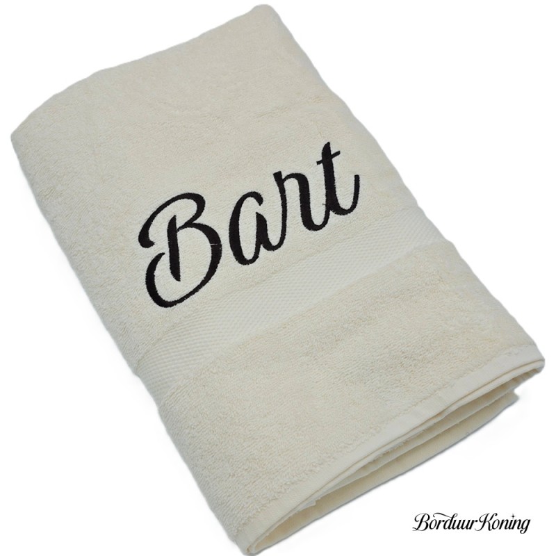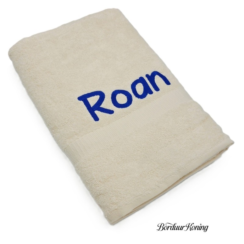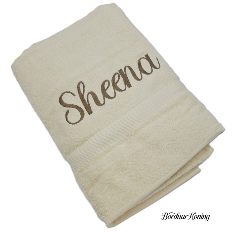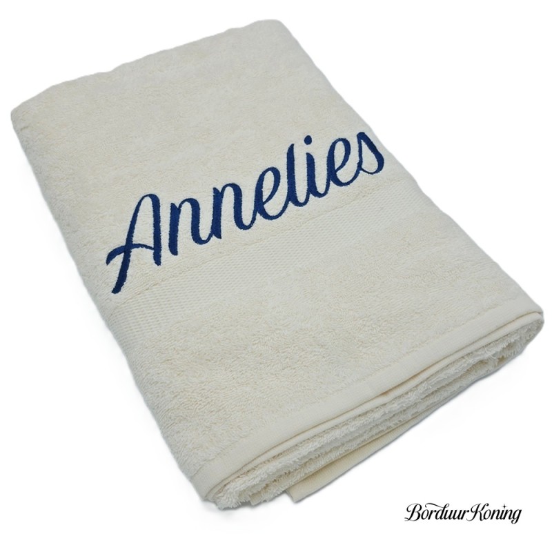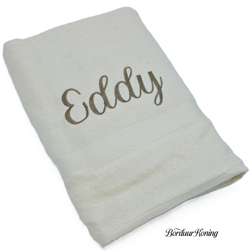 Douchelaken ecru, afmeting 70 x 140 cm, inclusief borduurwerk (1 regel).