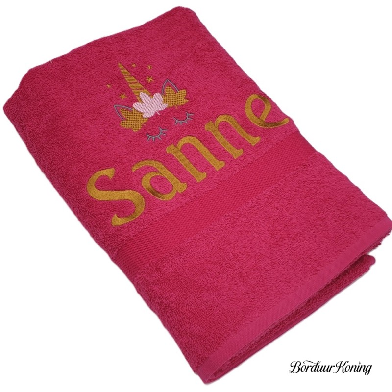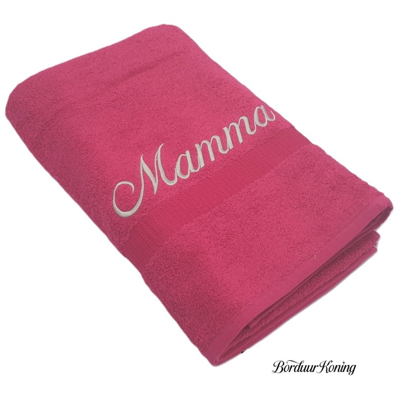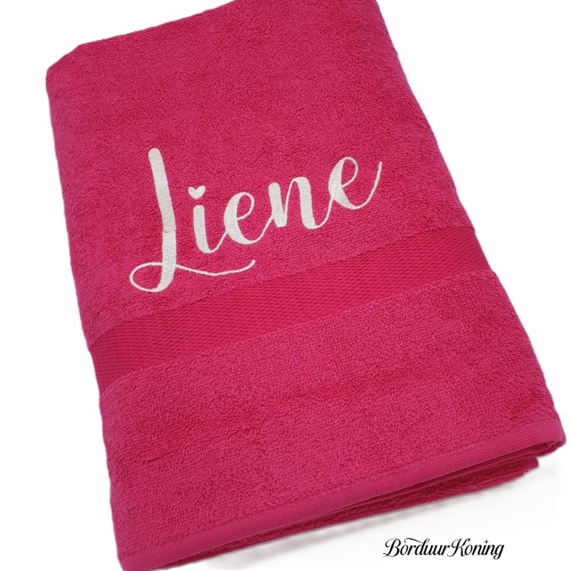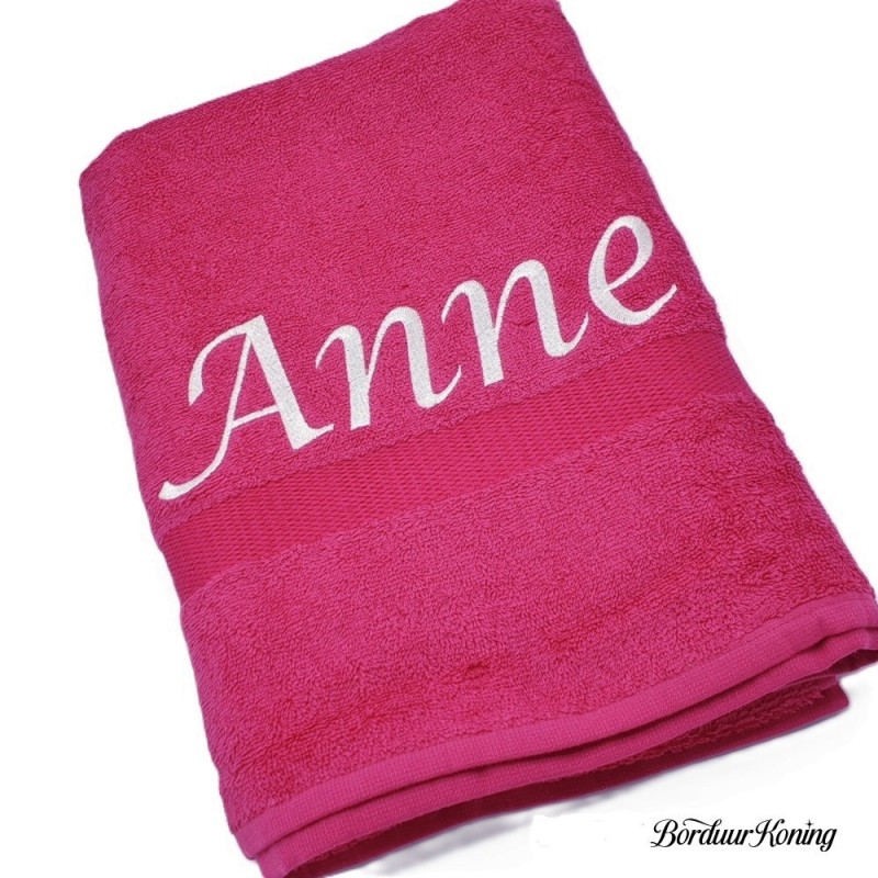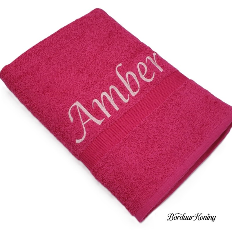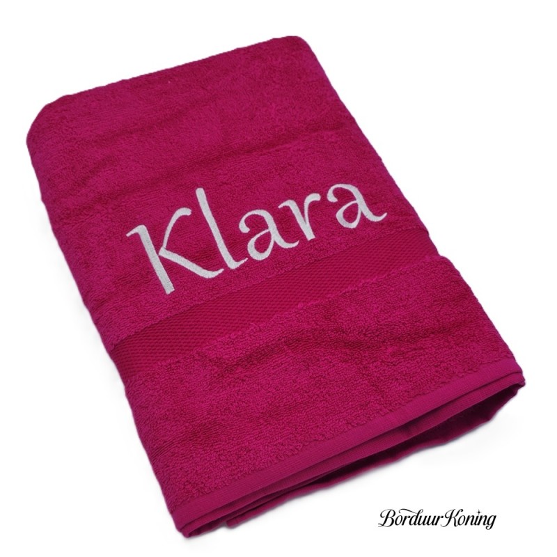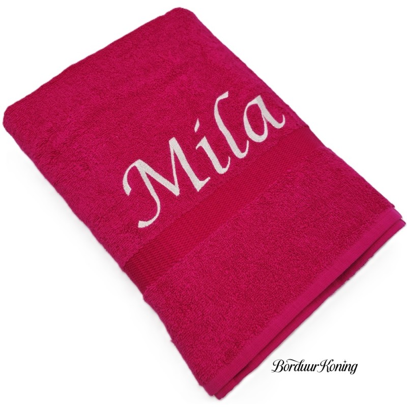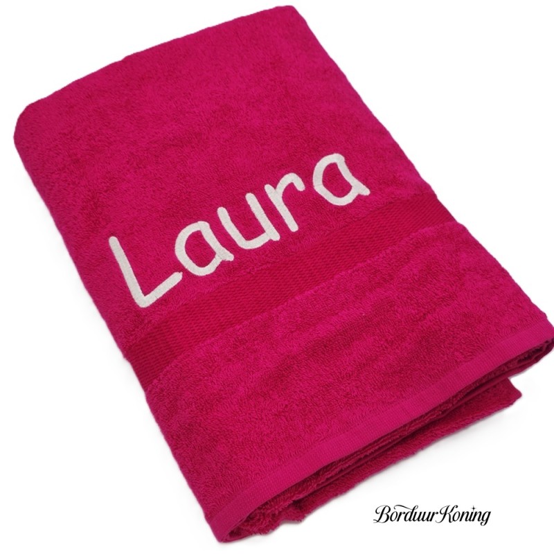 Douchelaken fuchsia, afmeting 70 x 140 cm, inclusief borduurwerk (1 regel).