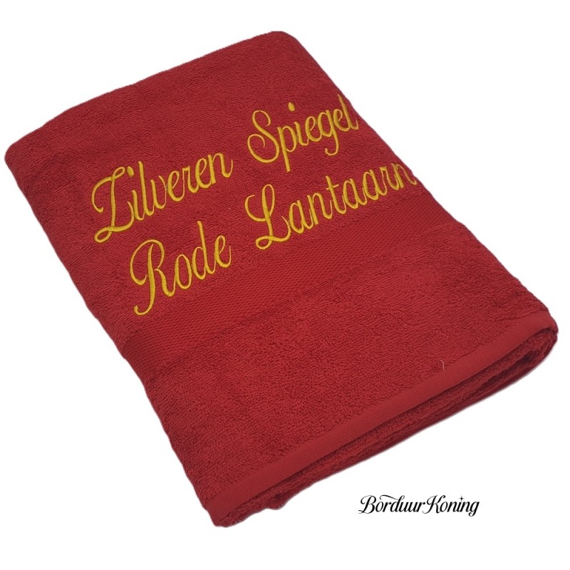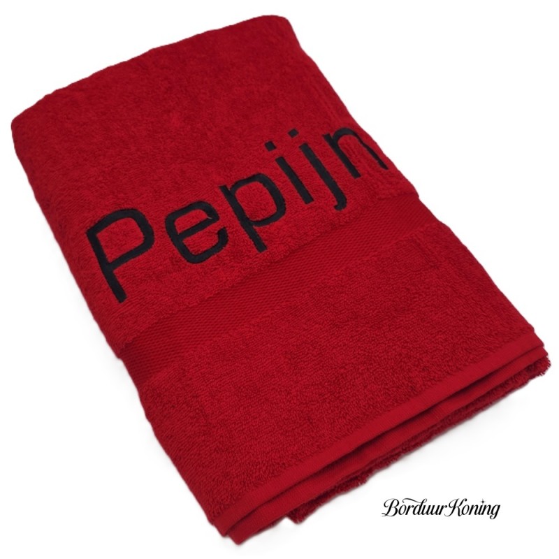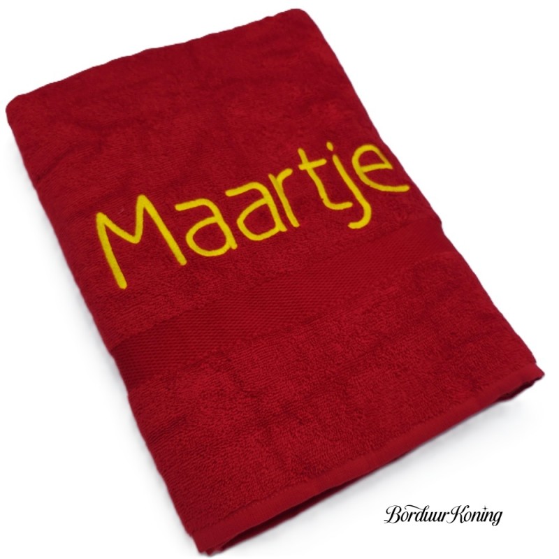 Douchelaken rood, afmeting 70 x 140 cm, inclusief borduurwerk (1 regel).