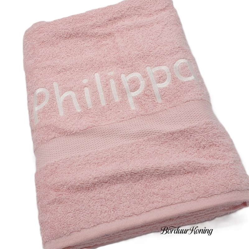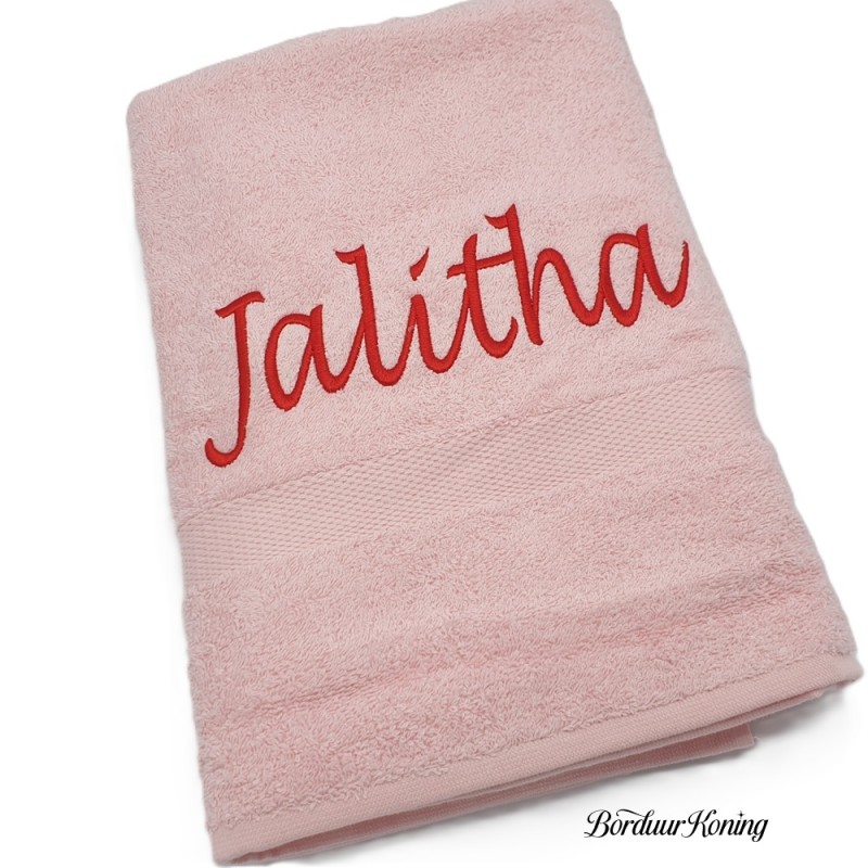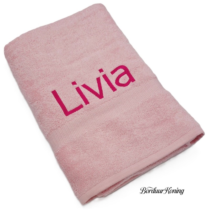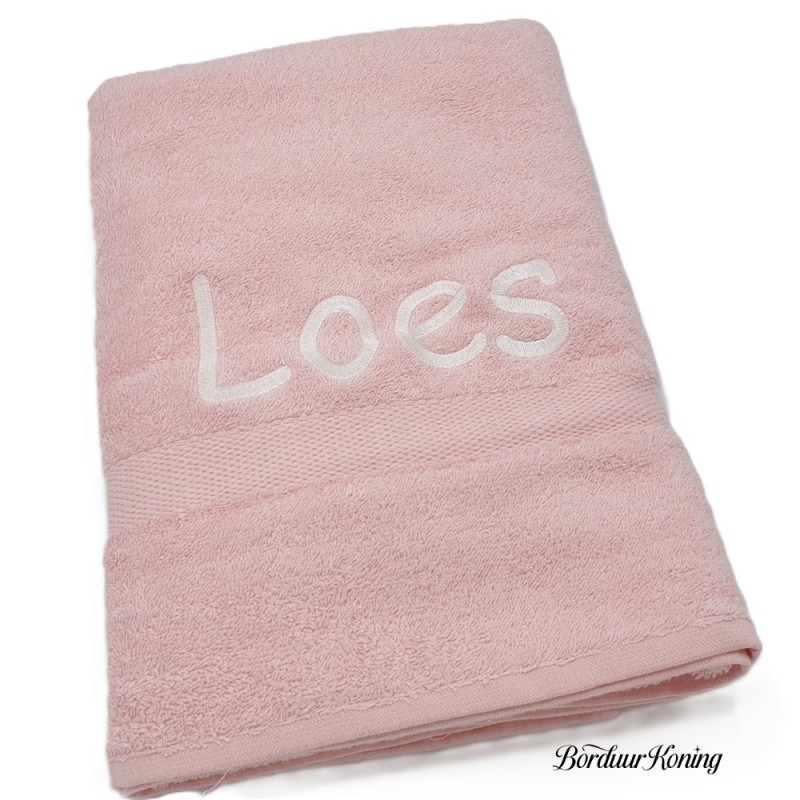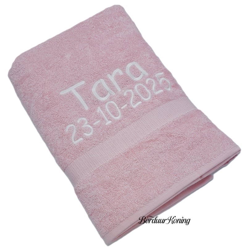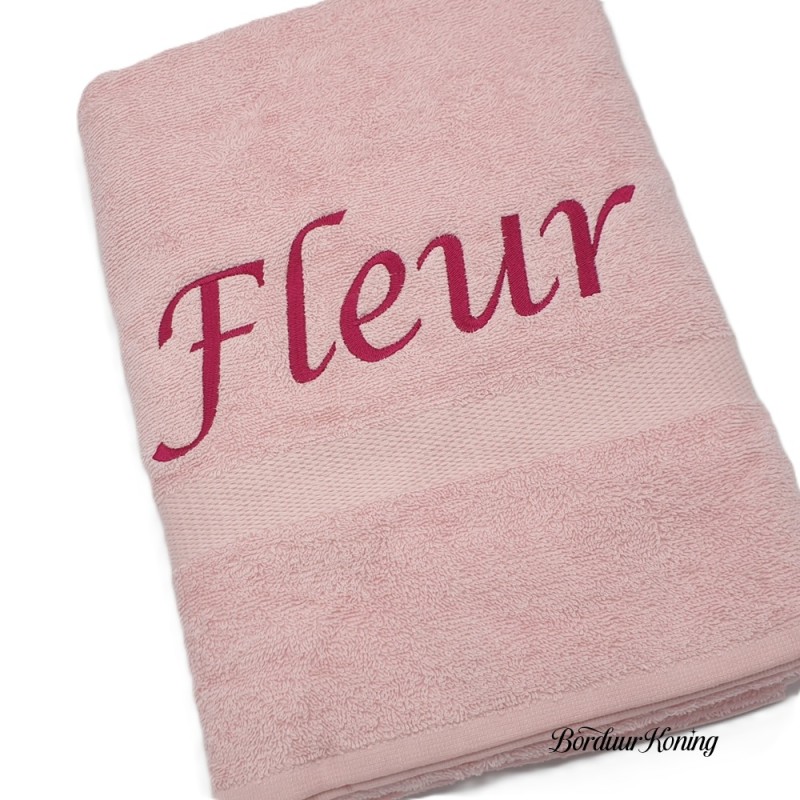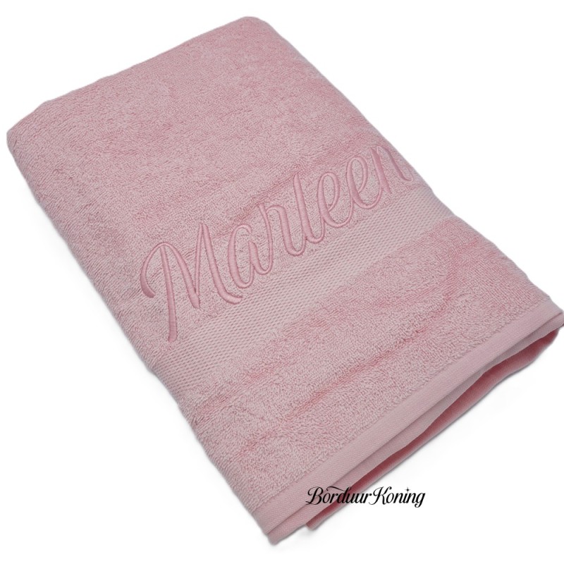 Douchelaken roze, afmeting 70 x 140 cm, inclusief borduurwerk (1 regel).