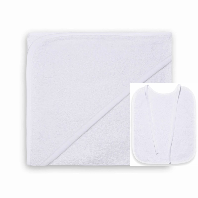 Baby set wit, bestaande uit een witte badcape en slabber met strik.