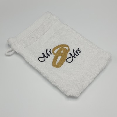 Bruiloft washand luxe wit met mr en mrs geborduurd met ringen