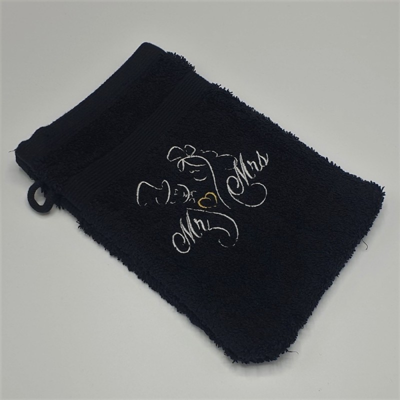 Bruiloft washand luxe zwart met mr en mrs geborduurd.