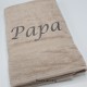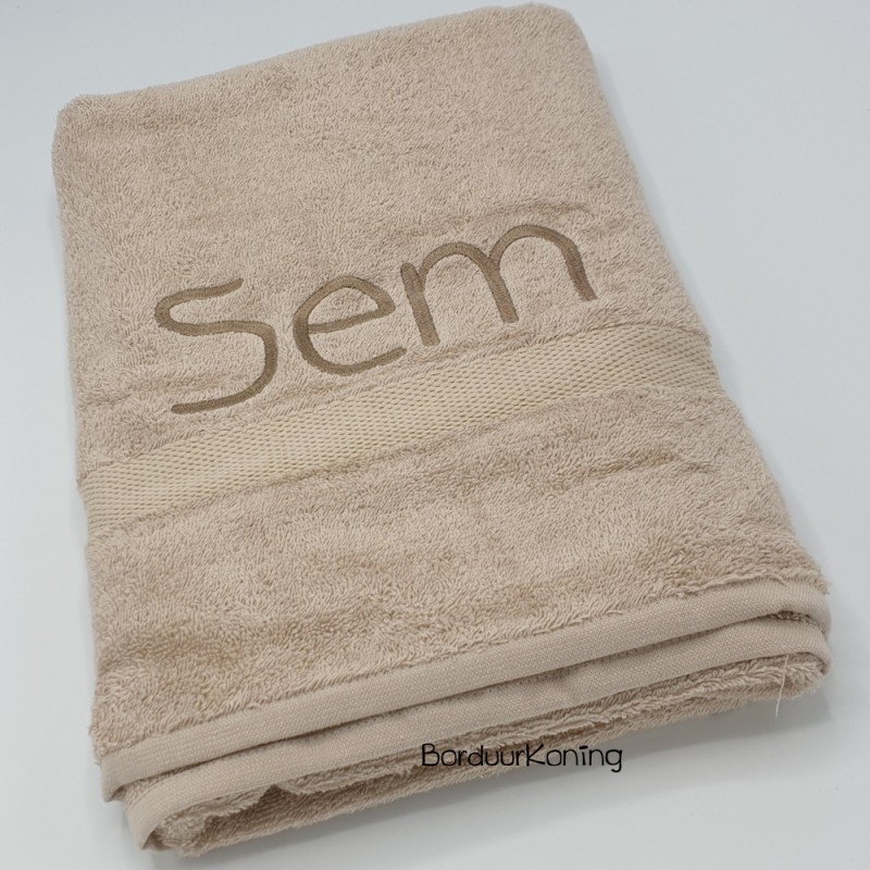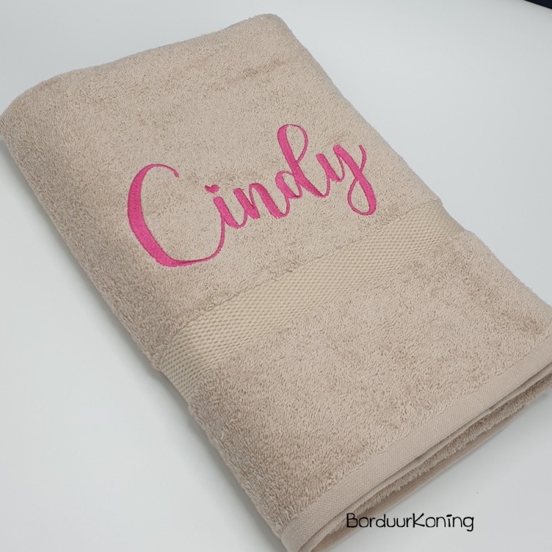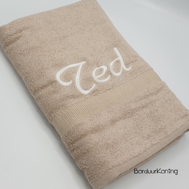 Douchelaken beige afmeting 70 x 140 cm, inclusief borduurwerk (1 regel).