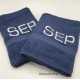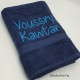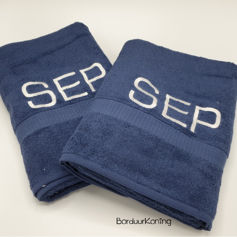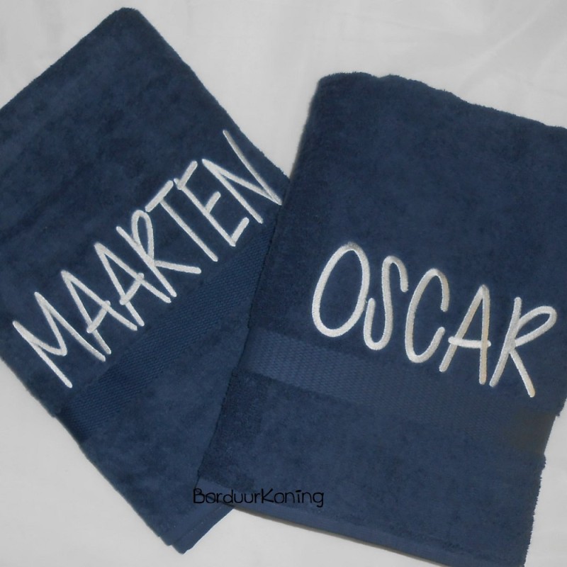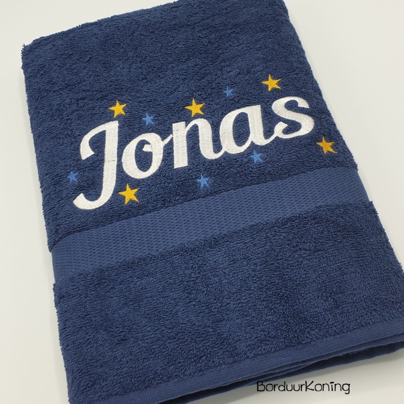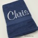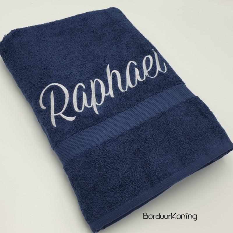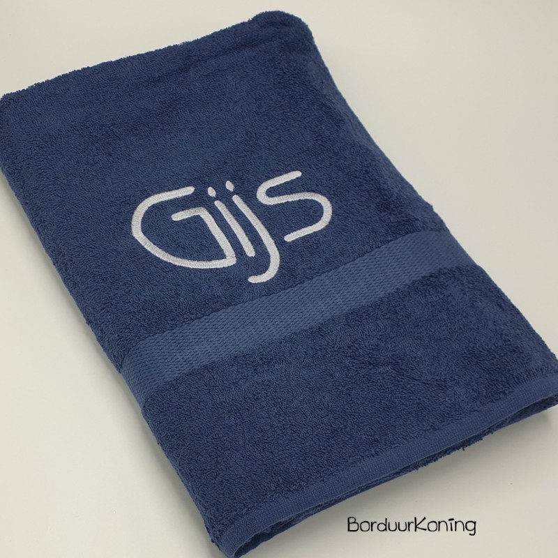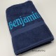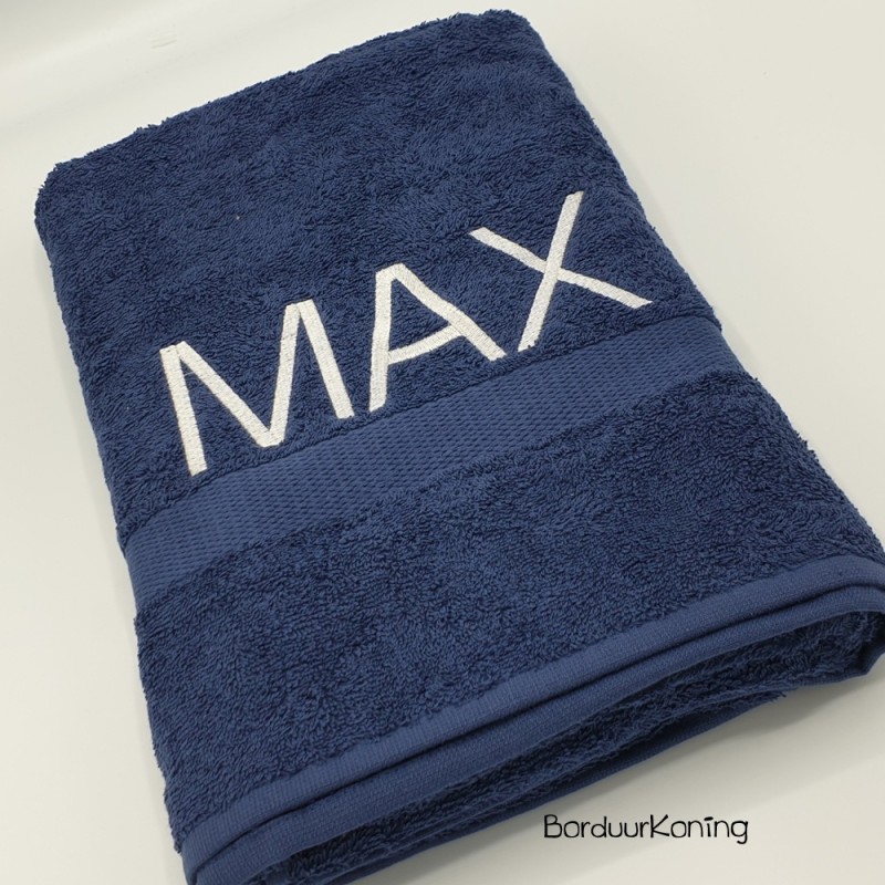 Douchelaken donkerblauw, afmeting 70 x 140 cm, inclusief borduurwerk (1 regel).