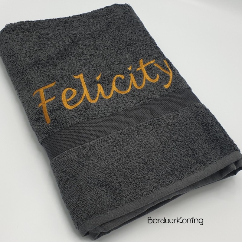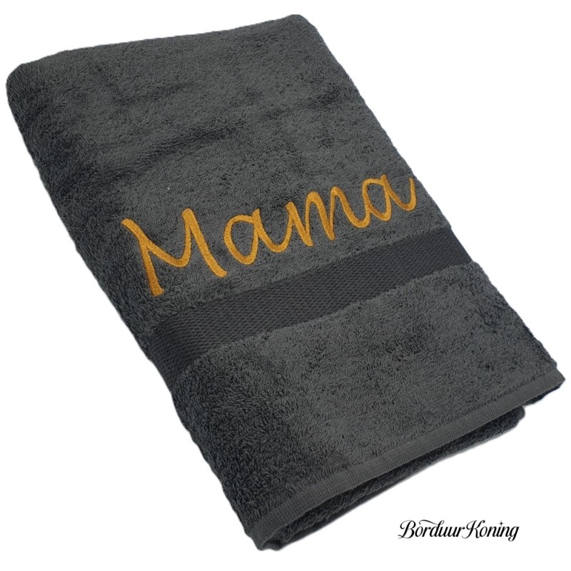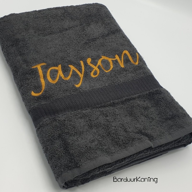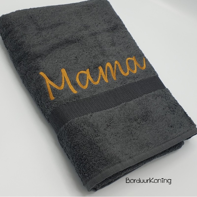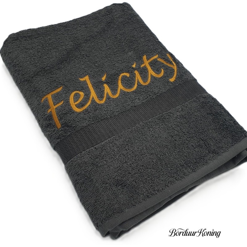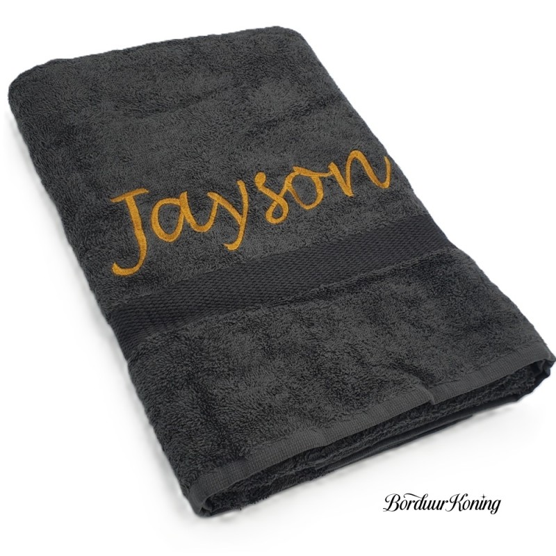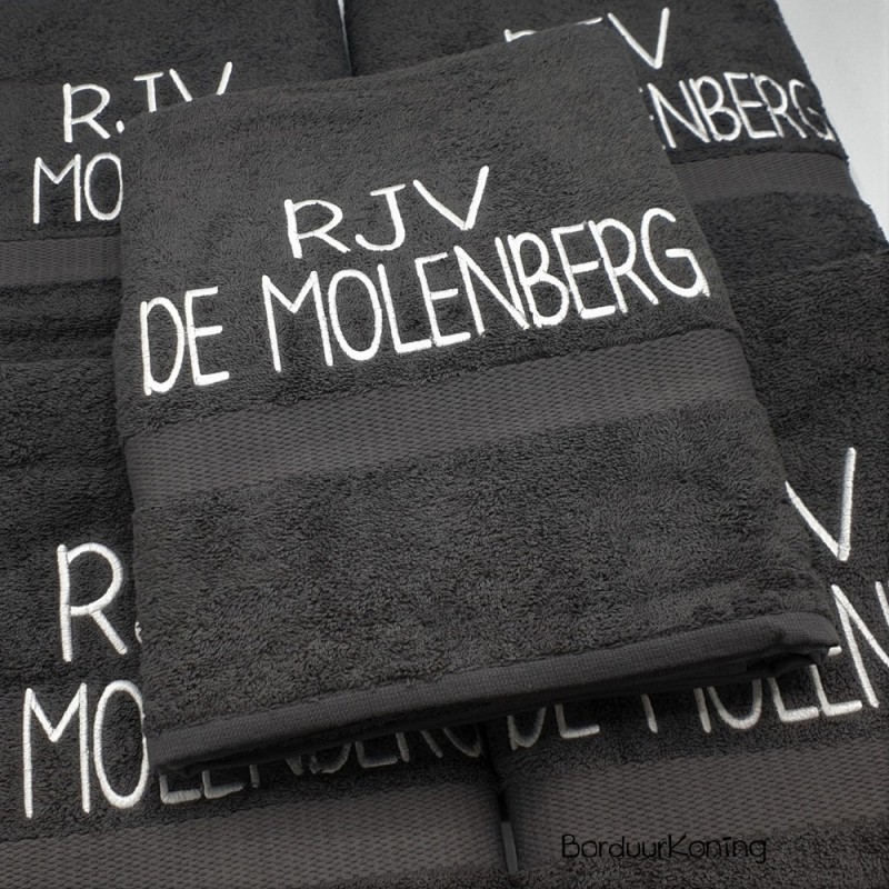 Douchelaken donkergrijs, afmeting 70 x 140 cm, inclusief borduurwerk (1 regel).