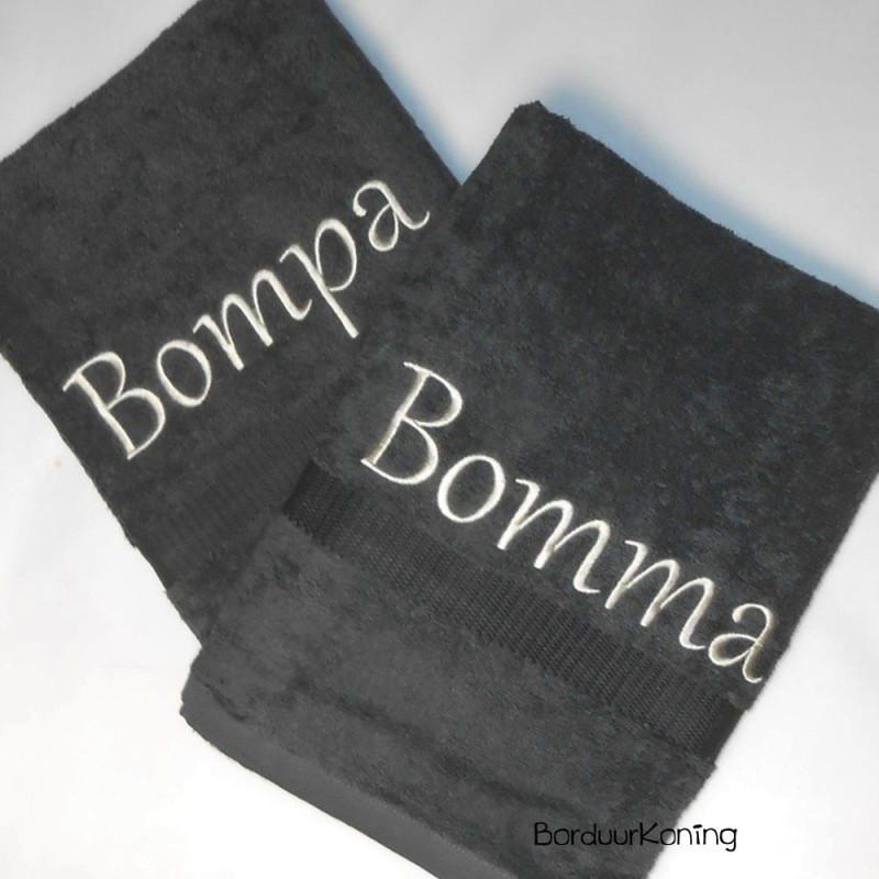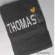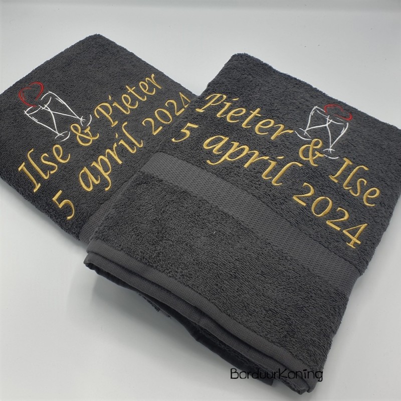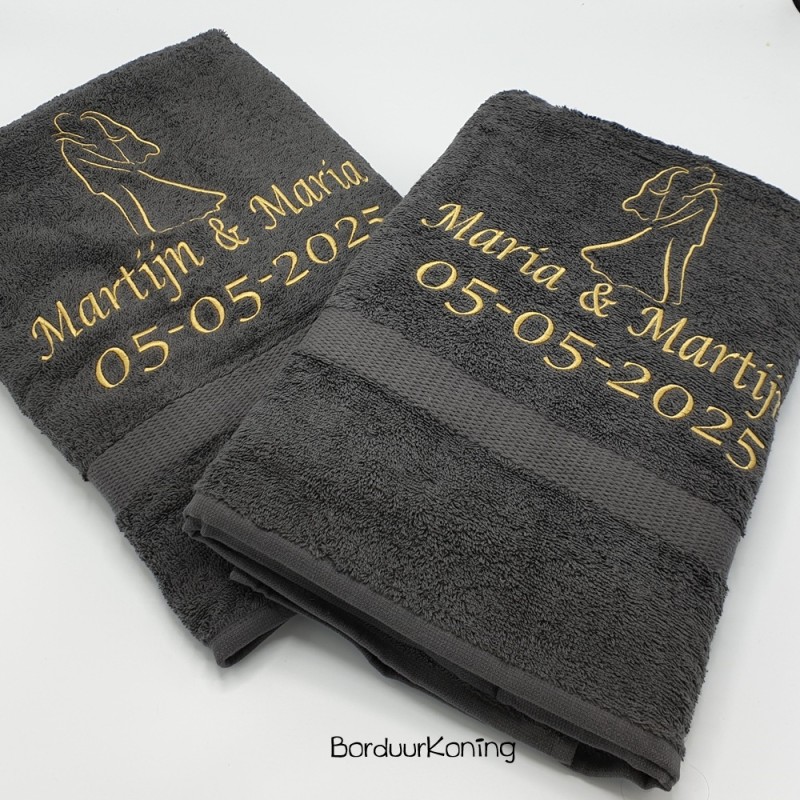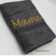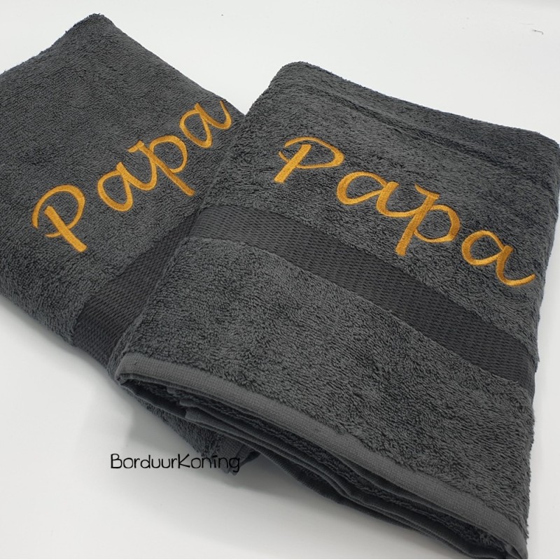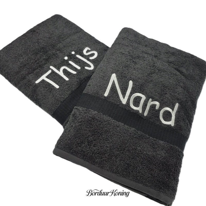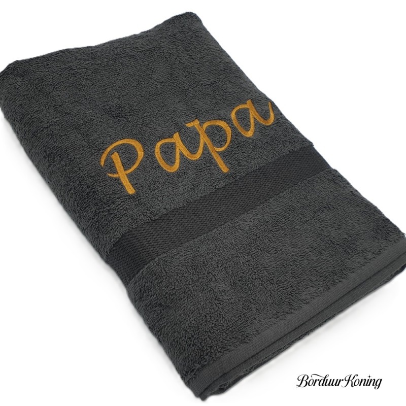 Douchelaken donkergrijs, afmeting 70 x 140 cm, inclusief borduurwerk (1 regel).