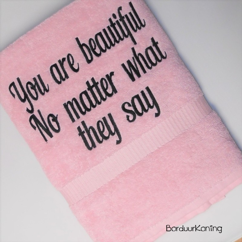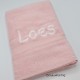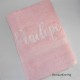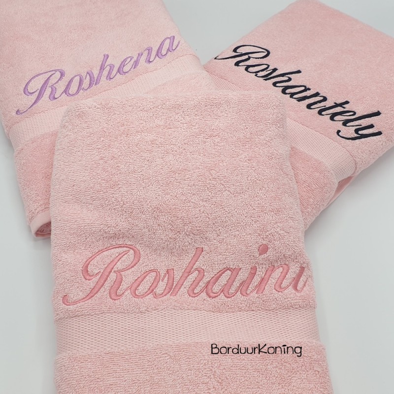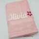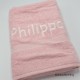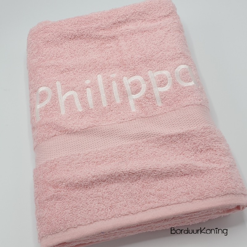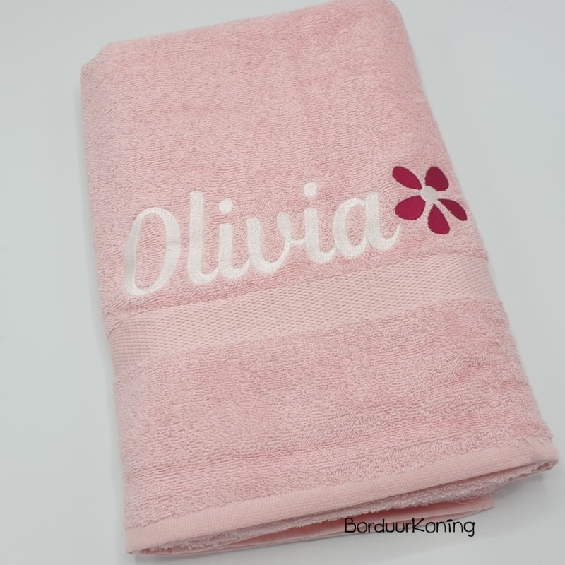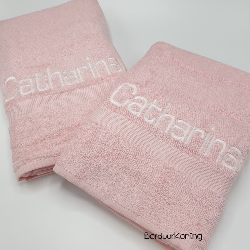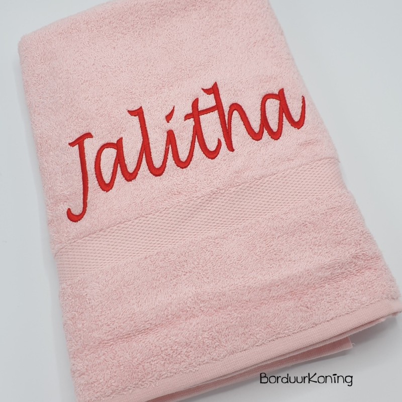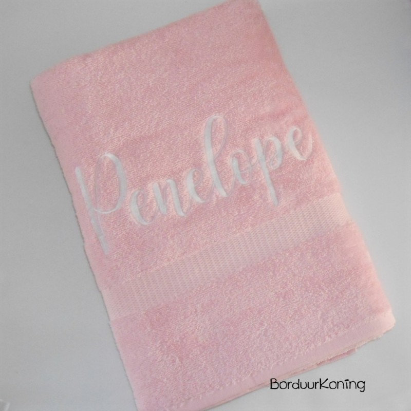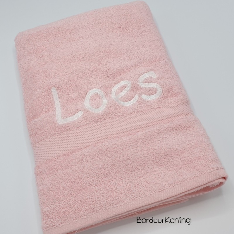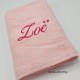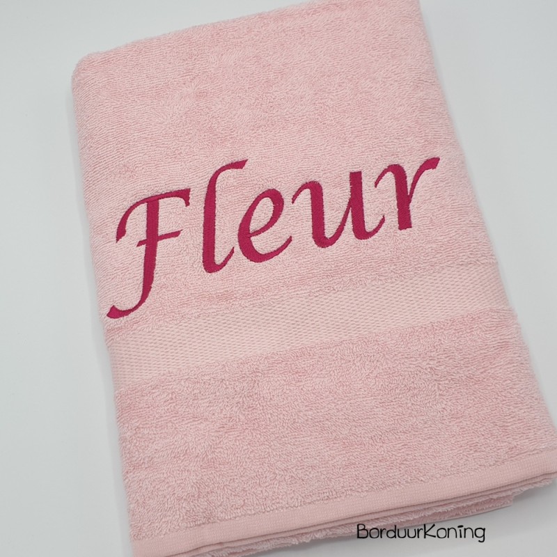Douchelaken roze, afmeting 70 x 140 cm, inclusief borduurwerk (1 regel).