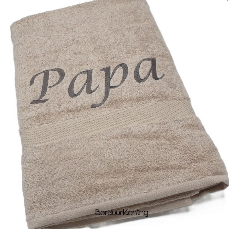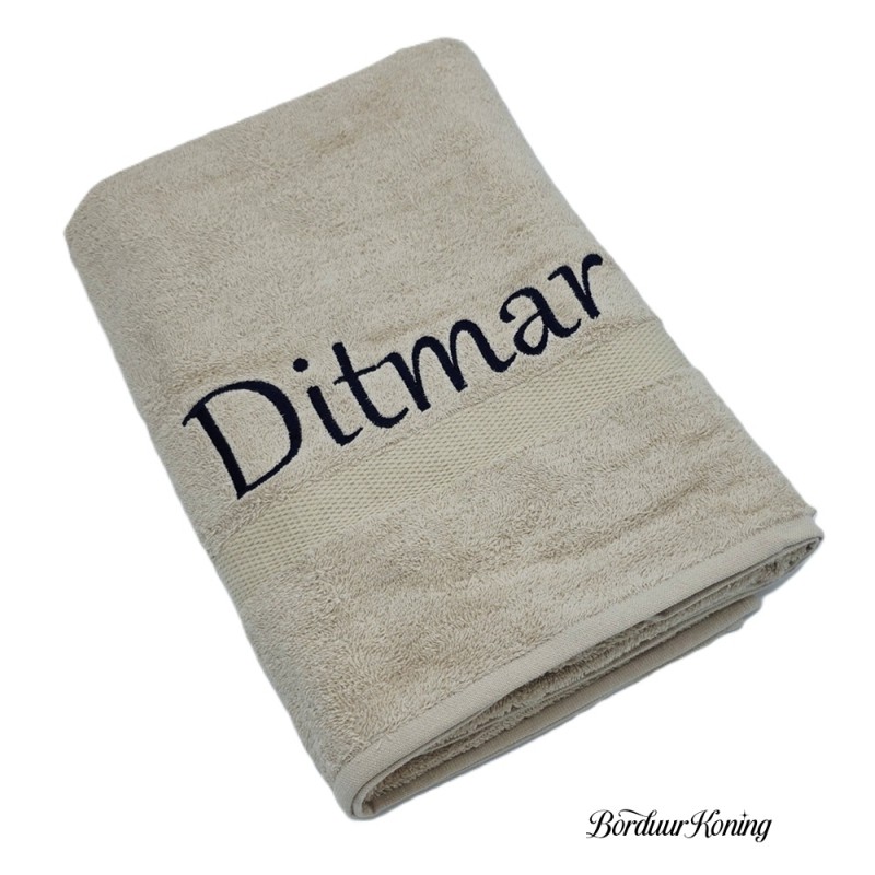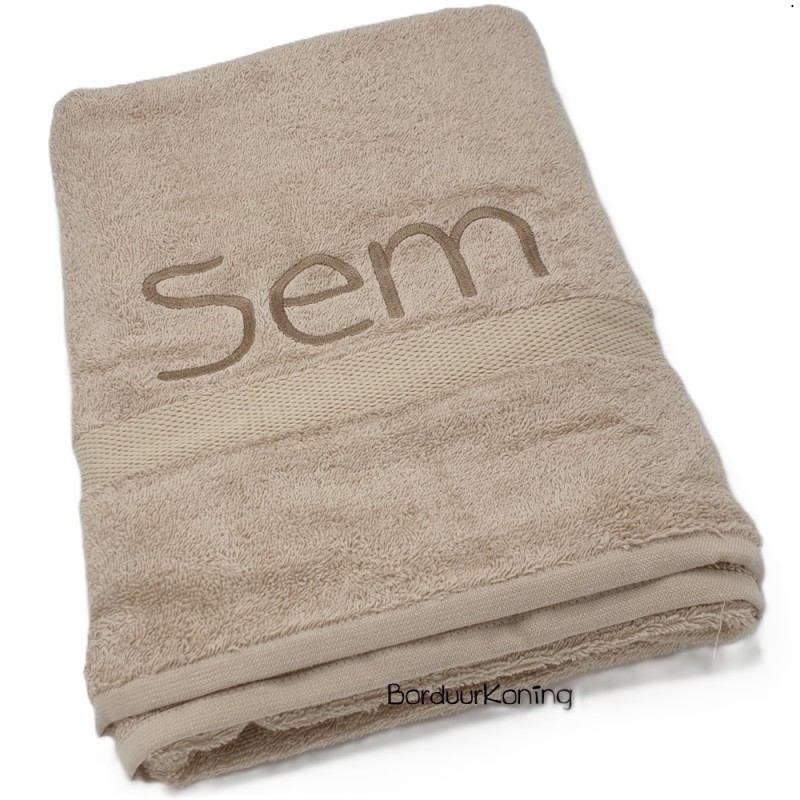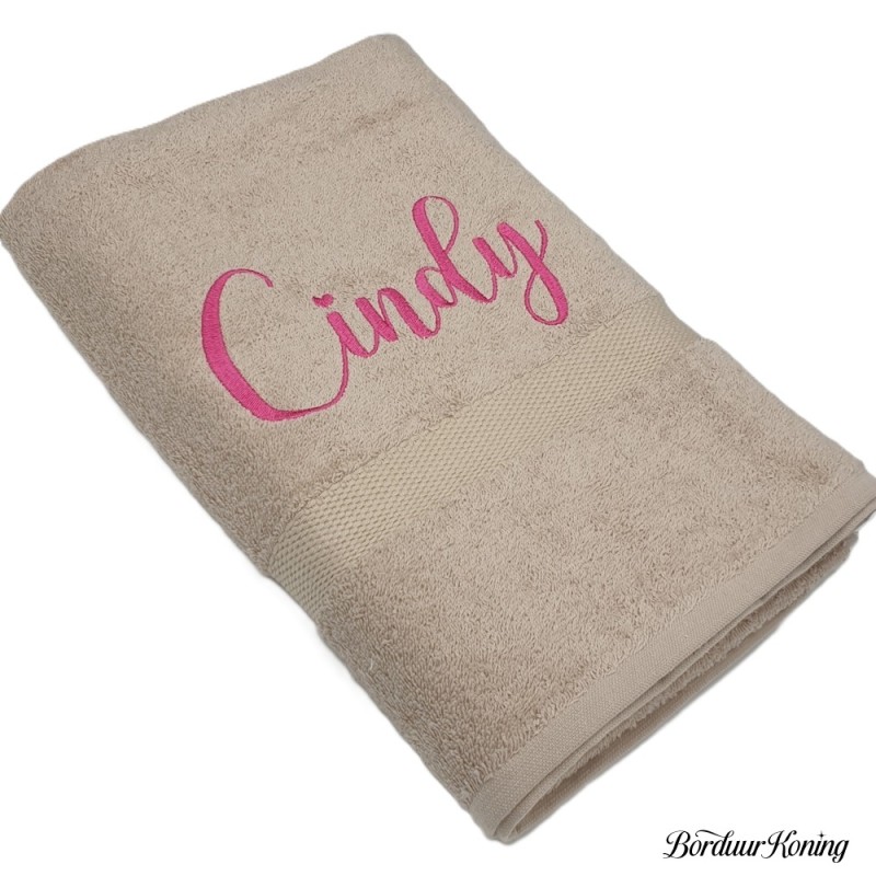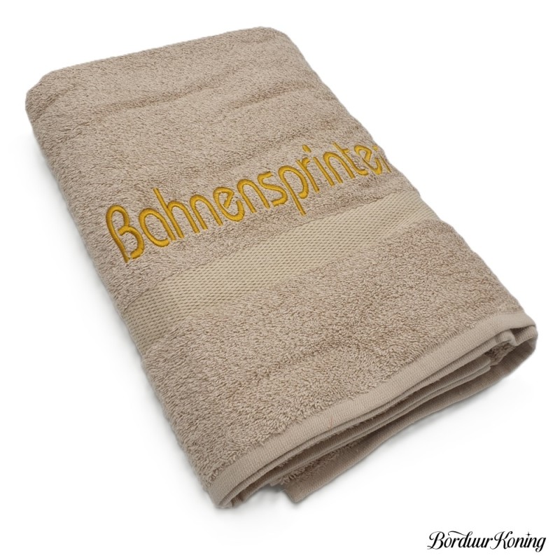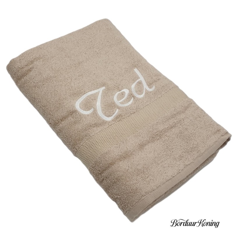 Douchelaken beige afmeting 70 x 140 cm, inclusief borduurwerk (1 regel).
