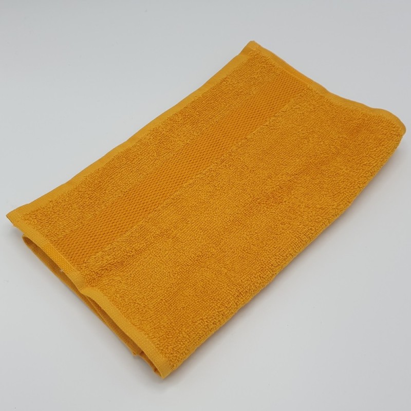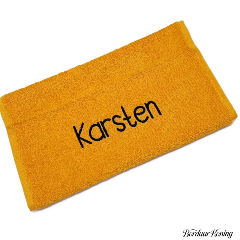 Gastendoek okergeel afmeting 30 x 50 cm inclusief borduurwerk 1 regel.