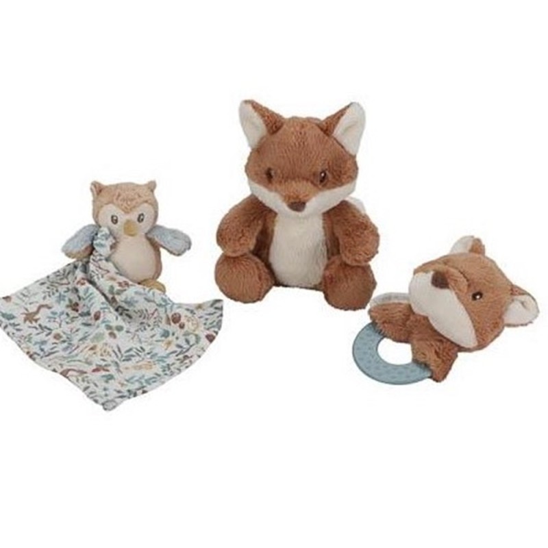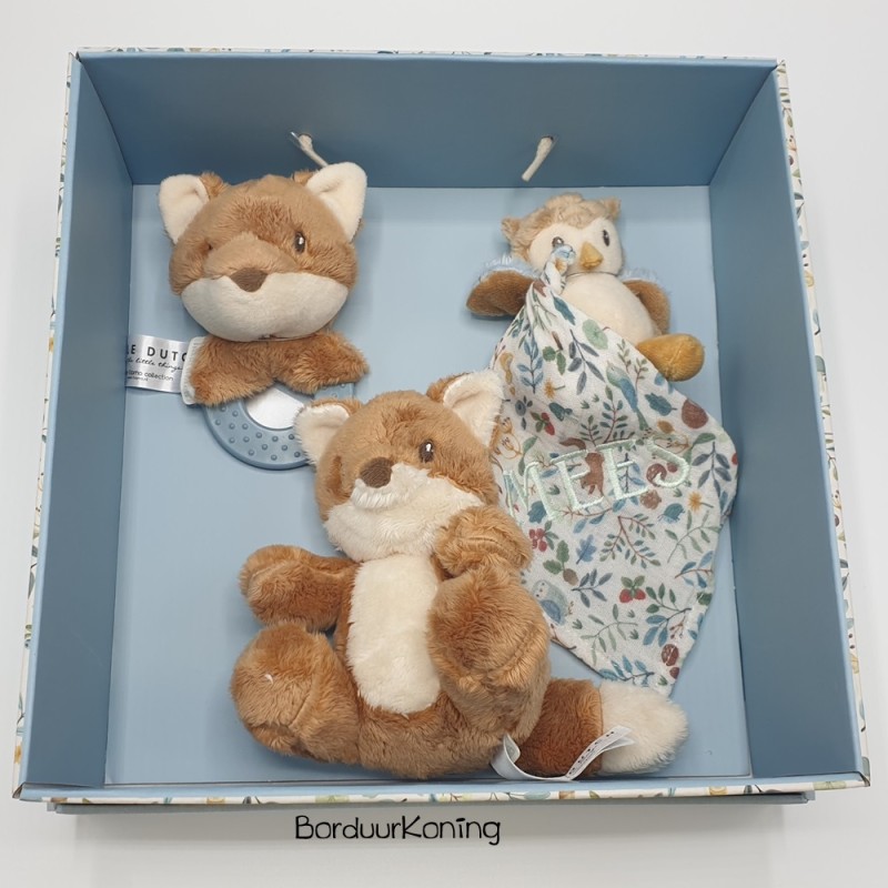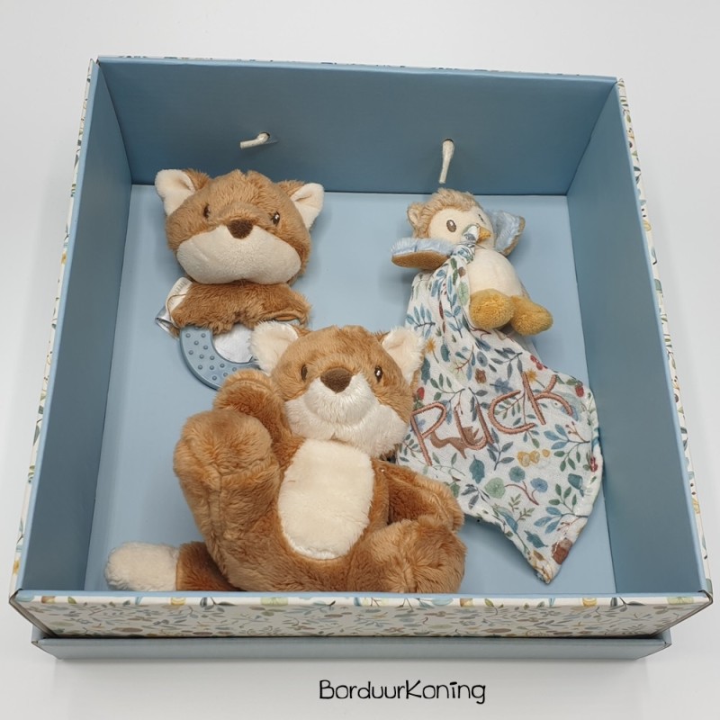 De geschenkdoos bevat een knuffeldoekje uil, bijtring vos en een knuffel vos