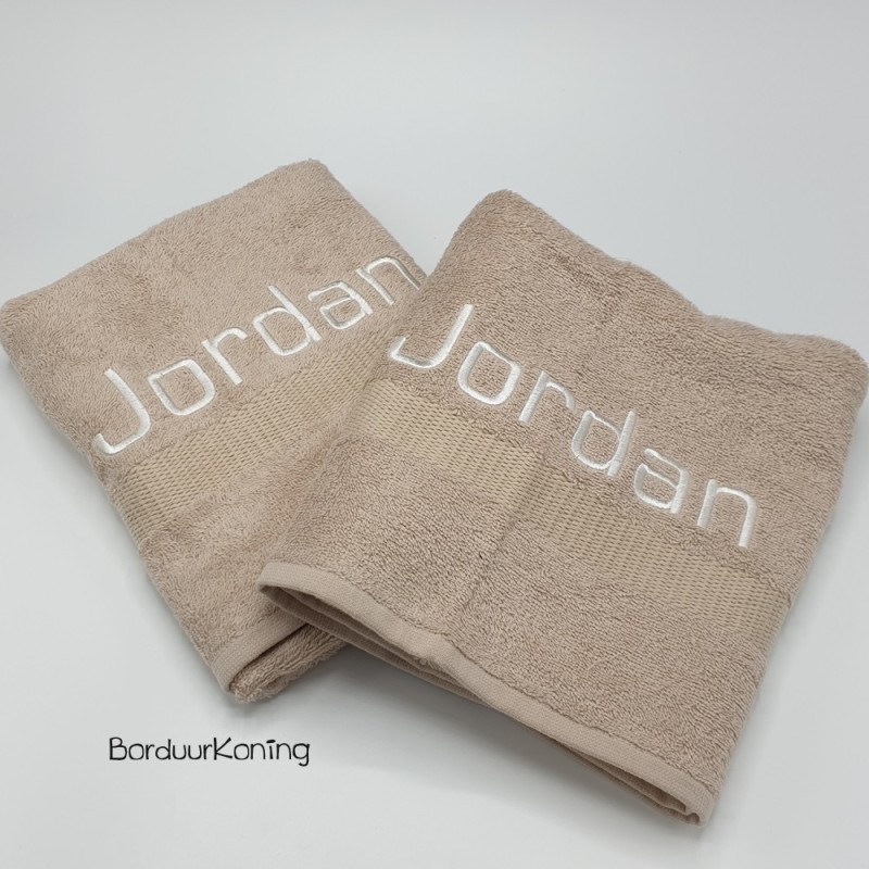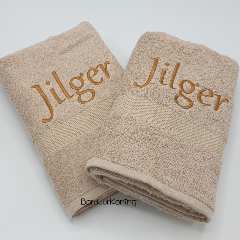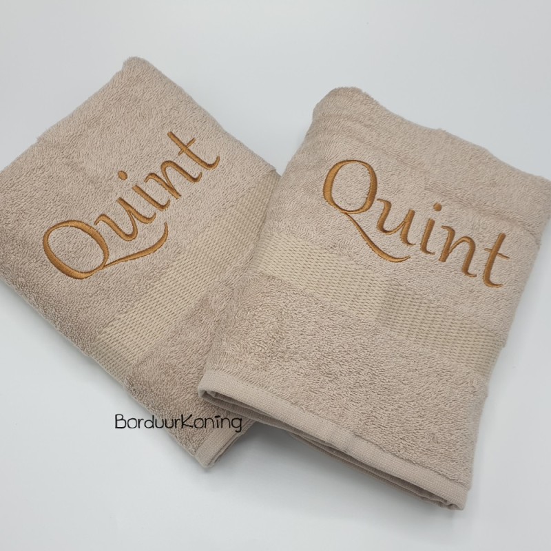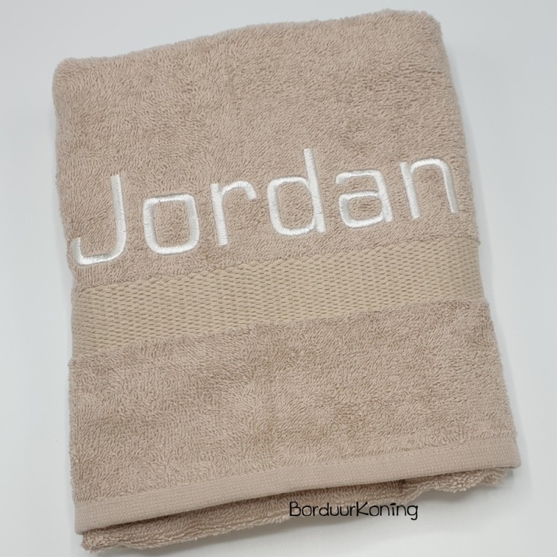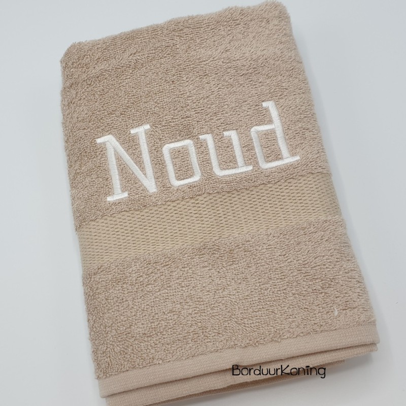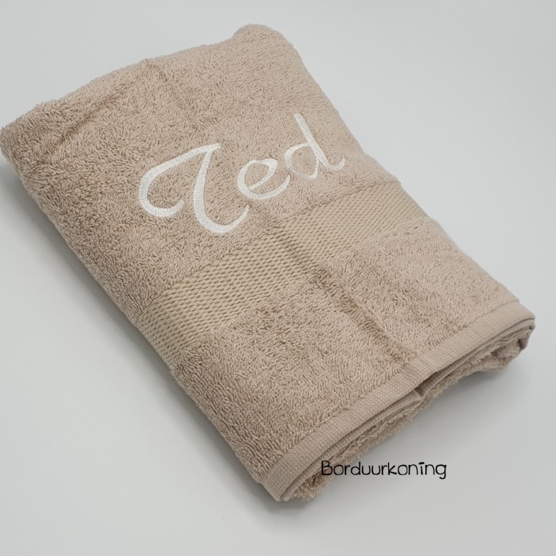 Handdoek beige, afmeting 50 x 100 cm inclusief borduurwerk. (1ste regel)