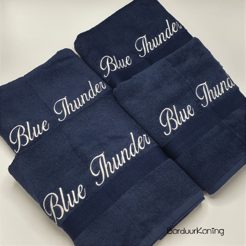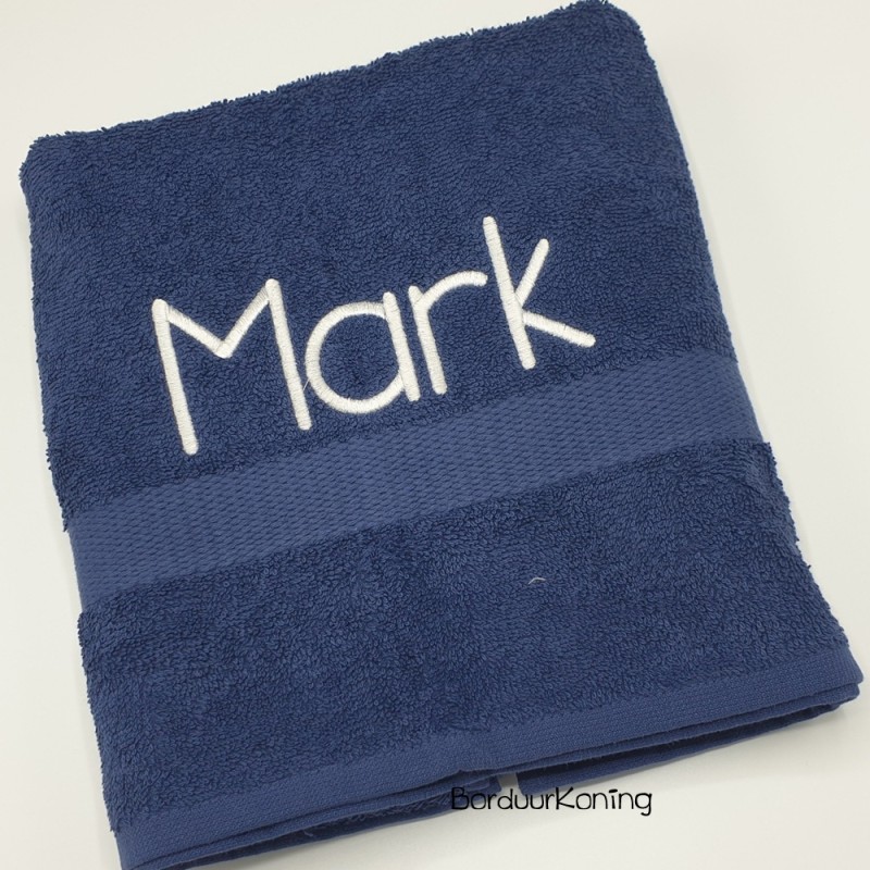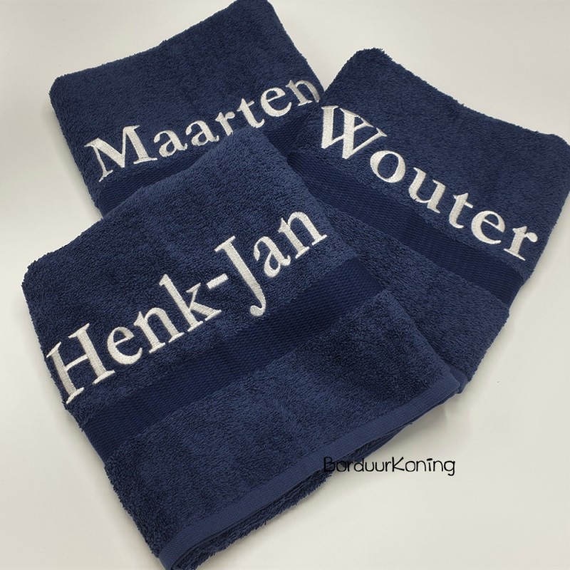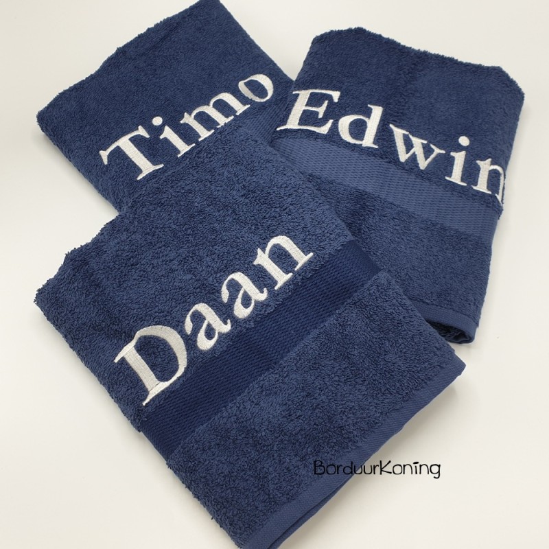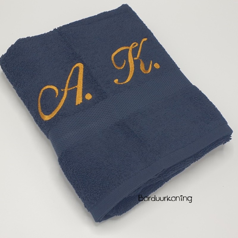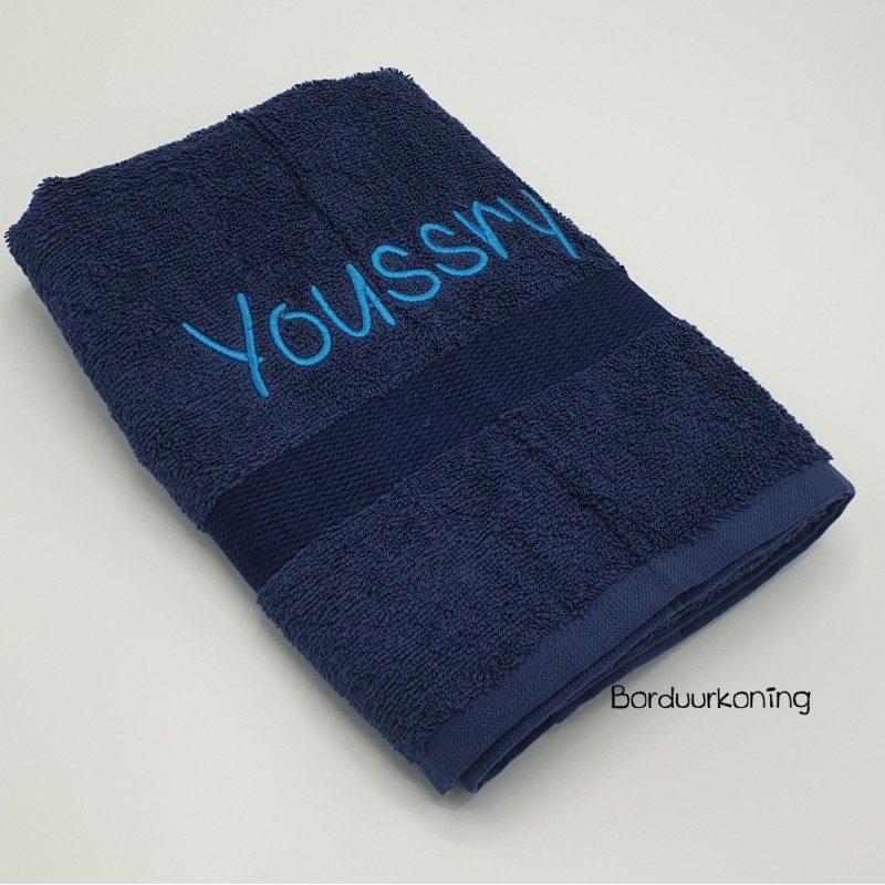 Handdoek donkerblauw, afmeting 50 x 100 cm inclusief borduurwerk. (1ste regel)