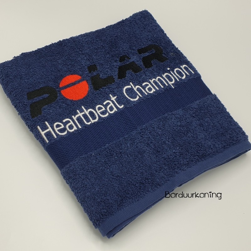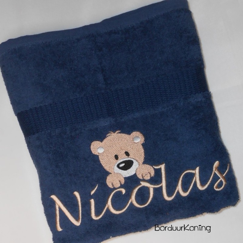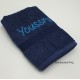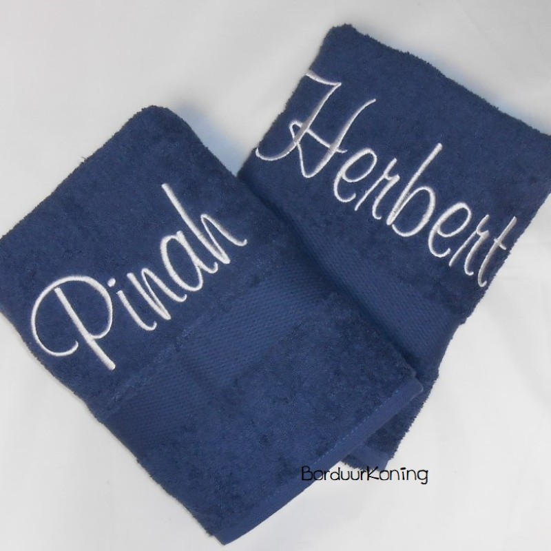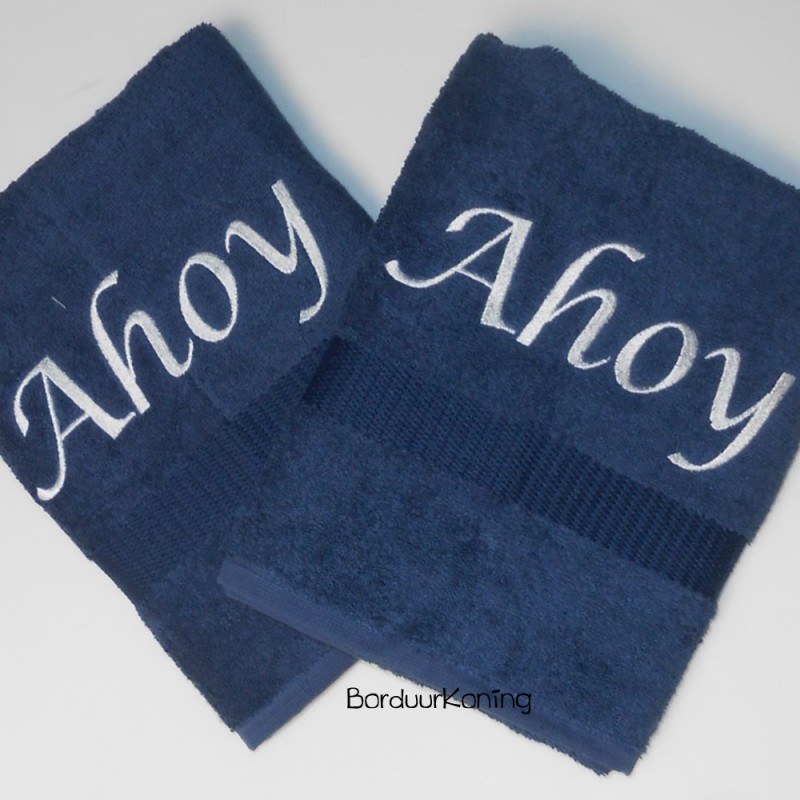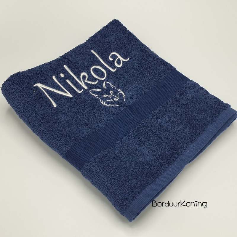 Handdoek donkerblauw, afmeting 50 x 100 cm inclusief borduurwerk. (1ste regel)