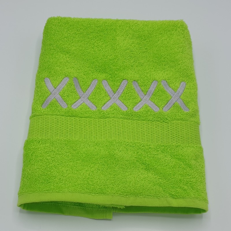 Handdoek afmeting 100 x 50 cm kleur Liime met XXXXX in zilver geborduurd.