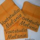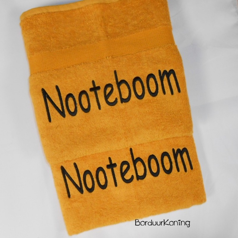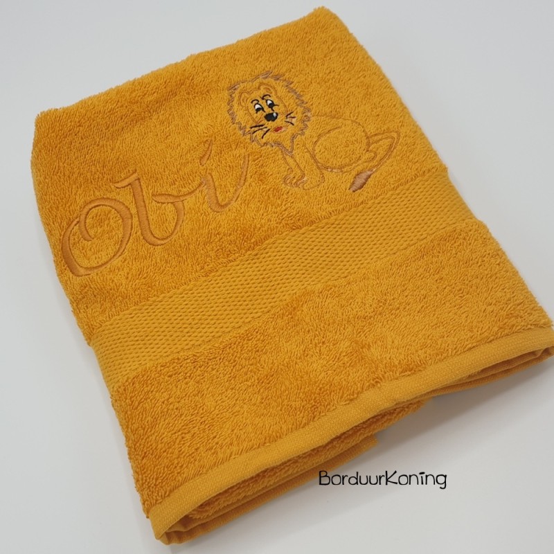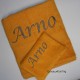 Handdoek okergeel, afmeting 50 x 100 cm inclusief borduurwerk. (1ste regel)