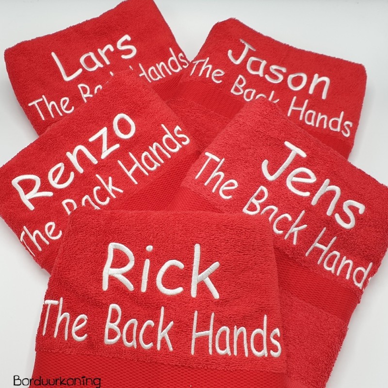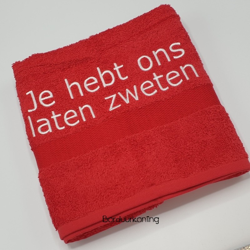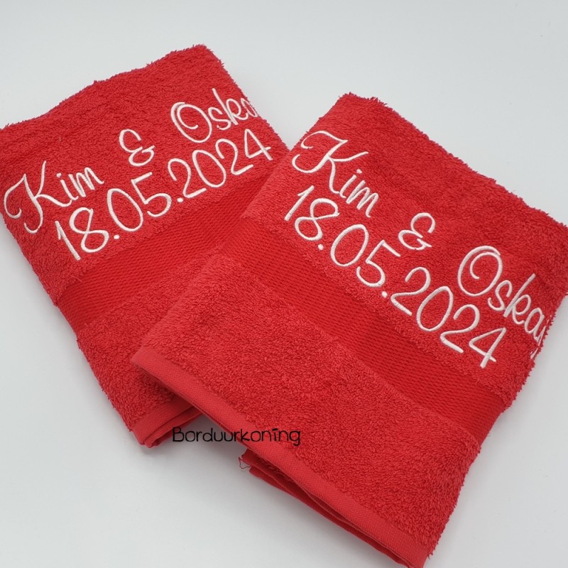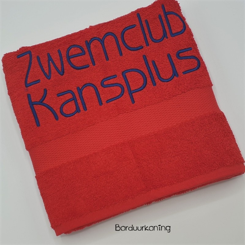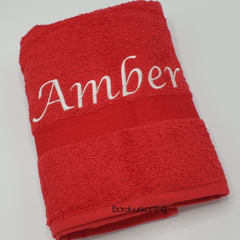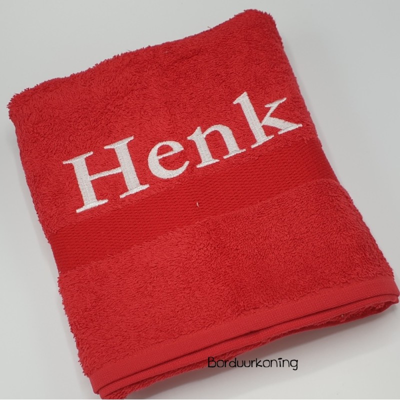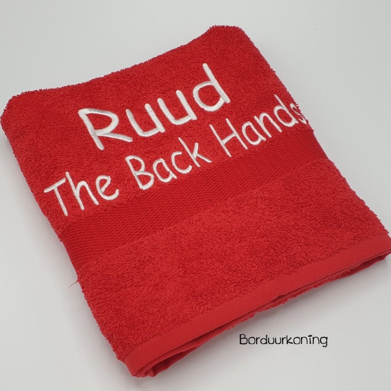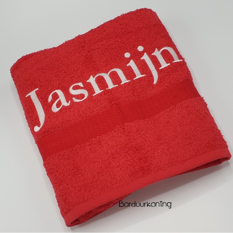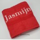 Handdoek rood, afmeting 50 x 100 cm inclusief borduurwerk. (1ste regel)