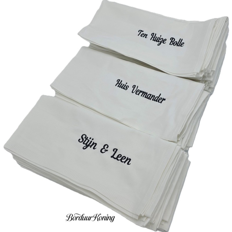 Servet borduren met naam of letter borduren in de rand naam wordt recht geborduurd in de 4.5 cm brede satijn rand, alleen 1 letter kan schuin de satijnen rand geborduurd worden.