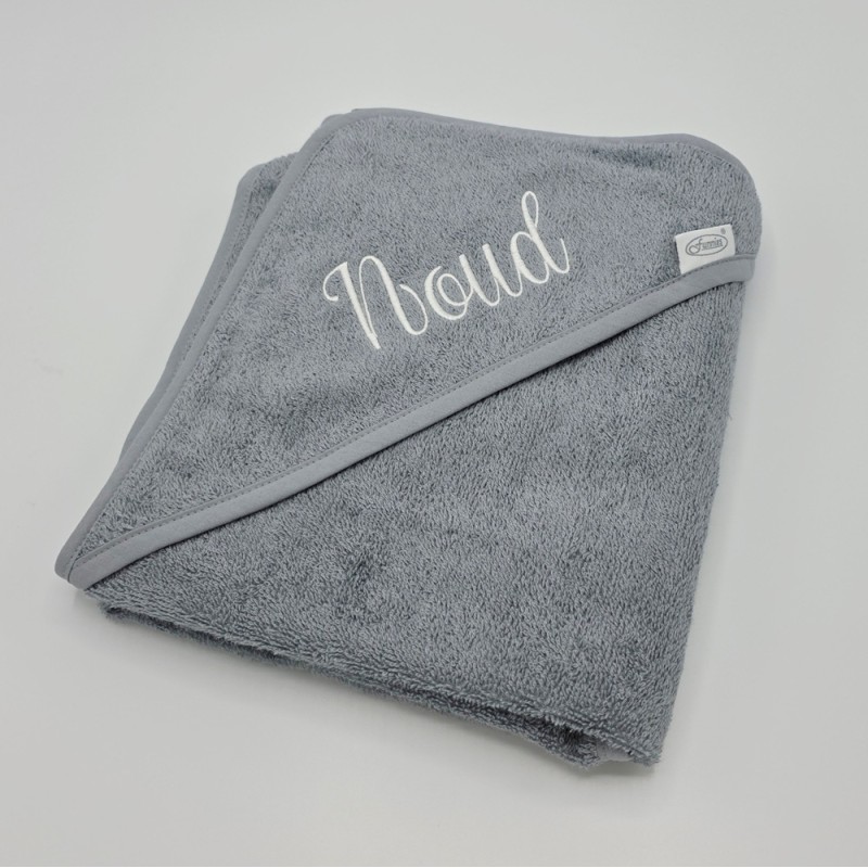 Badcape/ wikkeldoek in de kleur Olifantgrijs 80 x 80 cm met de naam Noud geborduurd in het ivoor