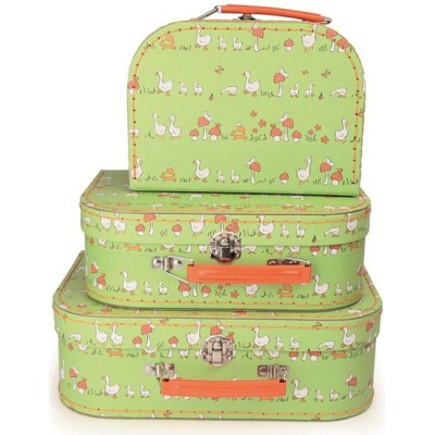Het koffertje is bedrukt met een leuke ganzen en paddenstoelen print.
