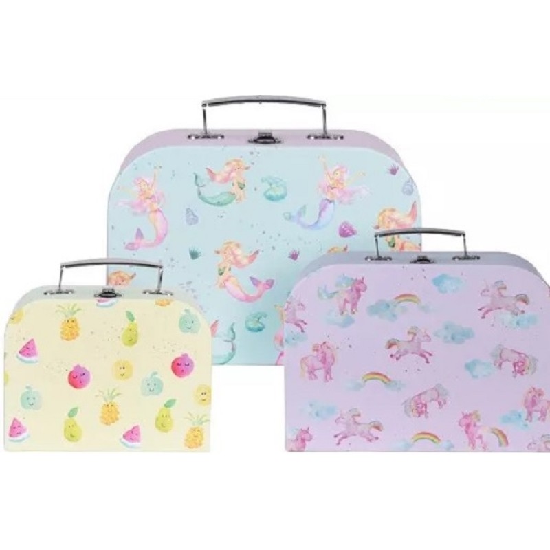 De middelste koffer is: 25 x 18 x 8,5 cm binnenzijde wit, buitenzijde print lichtroze, boven en onder print zeemeermin, mint.