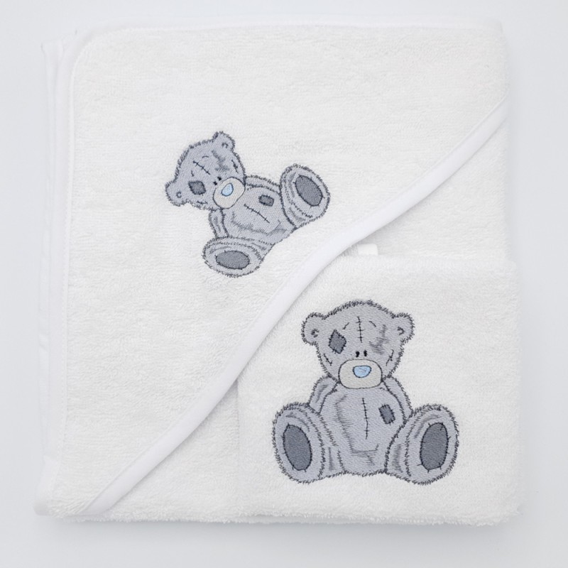 Kraam cadeau set witte badcape 80 x 80 cm en slabber 25 x40 cm met strik met een leuke beer geborduurd