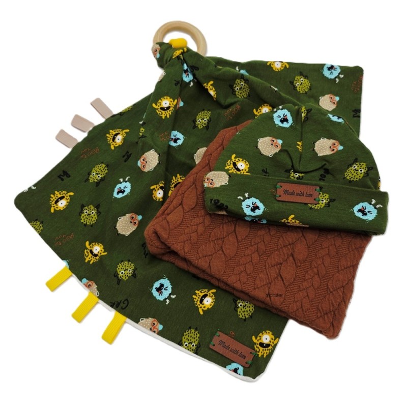 Knuffeldoekje met bijtring 22cm, babymuts in dezelfde monster print babymaat 56/68.