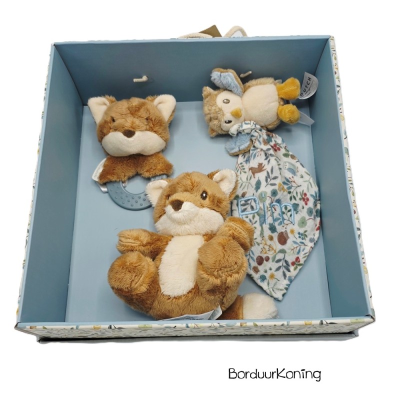 De geschenkdoos bevat een knuffeldoekje uil, bijtring vos en een knuffel vos