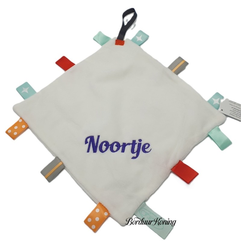 Fluweel zachte labeldoekje met speen bevestiging.