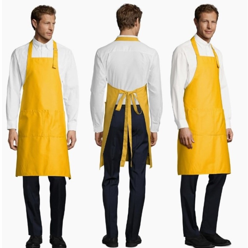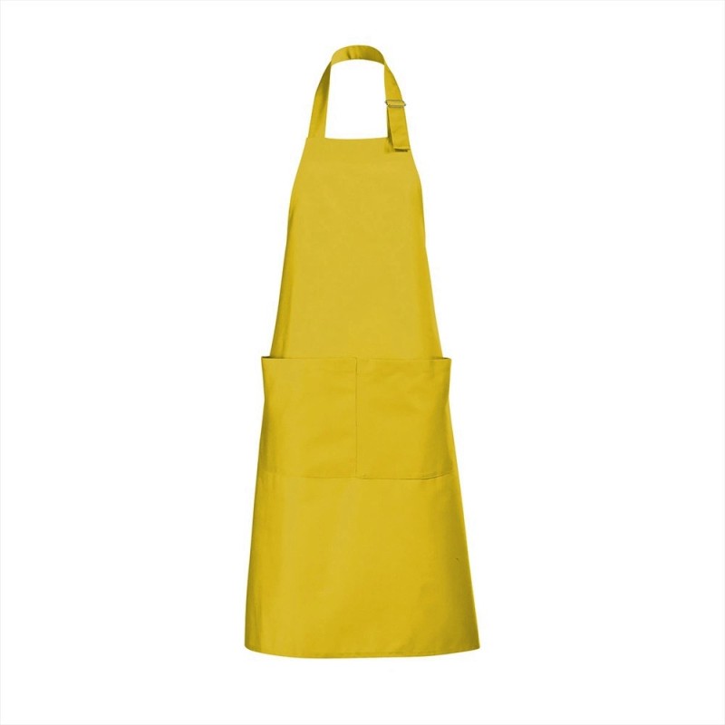 Schort goudgeel voor heren en dames 65% polyester en 35% katoen 240 g/m² en heeft 2 grote zakken aan voorkant.