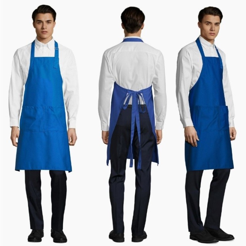 Schort kobalt voor heren en dames 65% polyester en 35% katoen 240 g/m² en heeft 2 grote zakken aan voorkant.