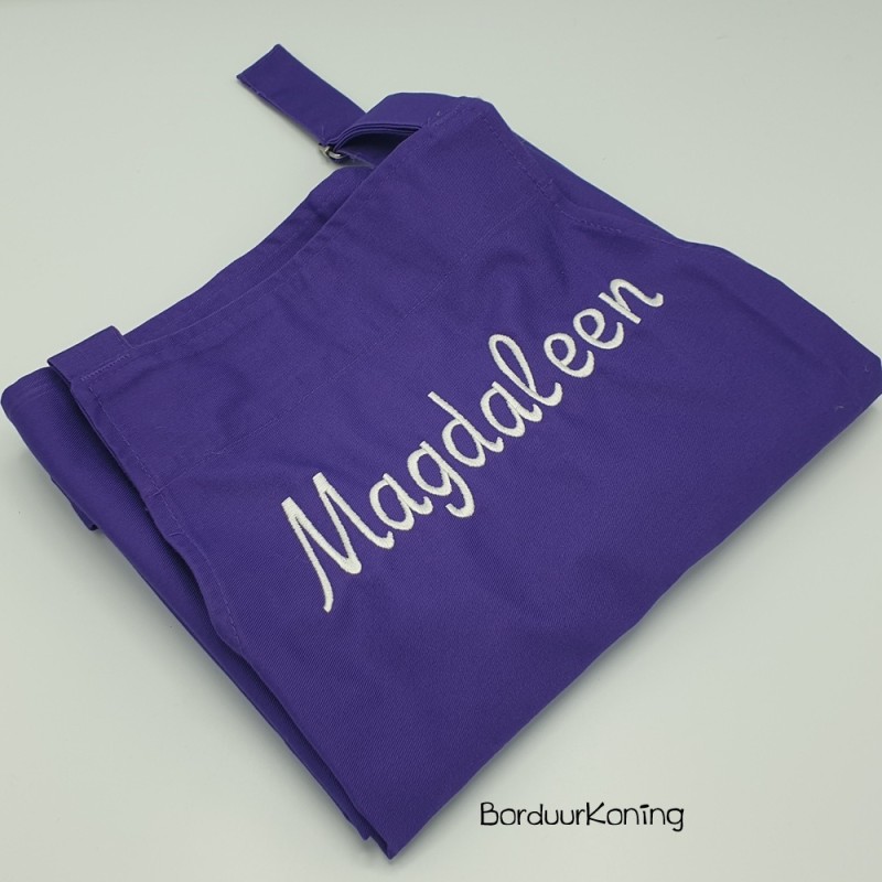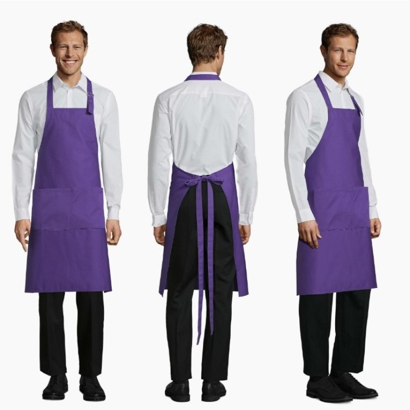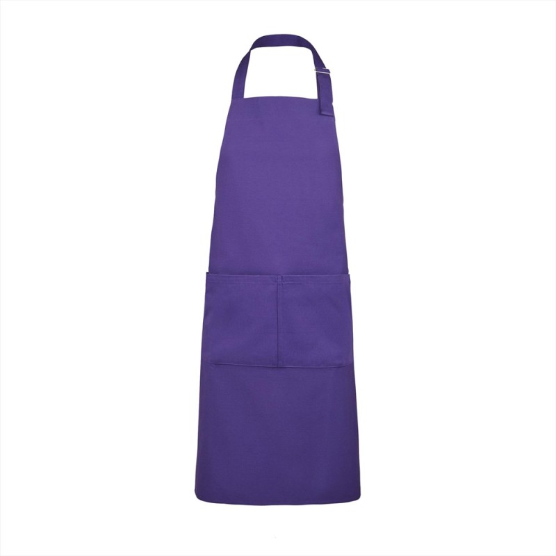Schort paars voor heren en dames 65% polyester en 35% katoen 240 g/m² en heeft 2 grote zakken aan voorkant.
