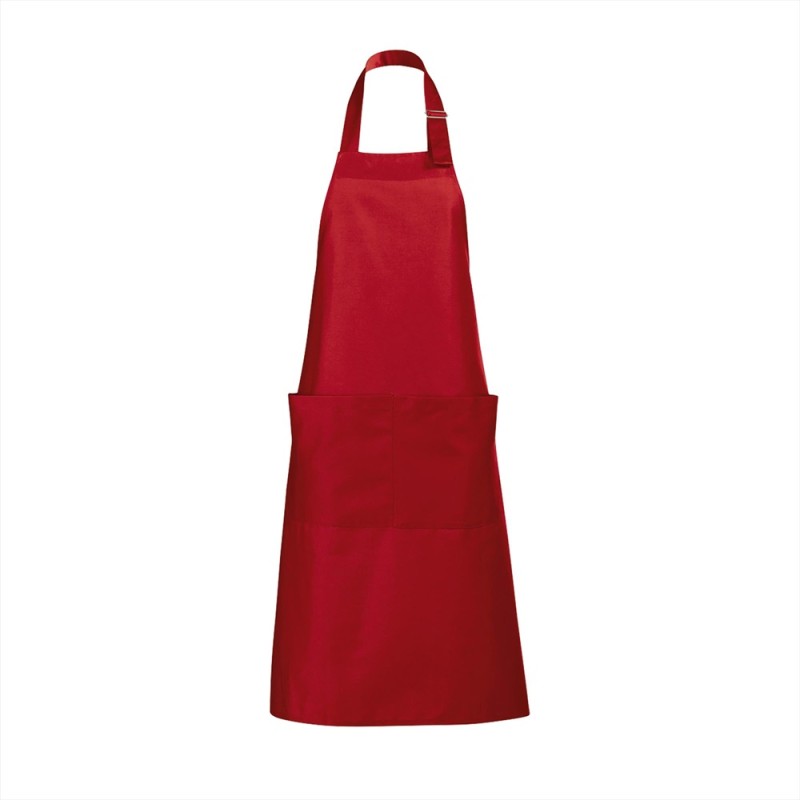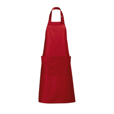 Schort rood voor heren en dames 65% polyester en 35% katoen 240 g/m² en heeft 2 grote zakken aan voorkant.