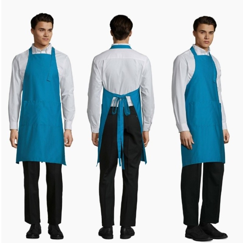 Schort turquoise voor heren en dames 65% polyester en 35% katoen 240 g/m² en heeft 2 grote zakken aan voorkant.