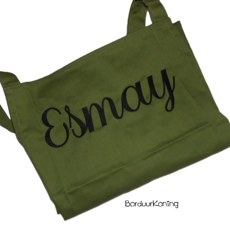 Naam of tekst wordt aan de bovenzijde geborduurd.