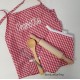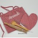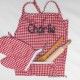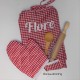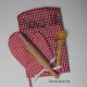Setje rood/ wit geruit bestaat uit een keukenschortje 50 cm lang en 40 cm breed een ovenhandschoen van 17 cm, pollepel, deegroller en garde.