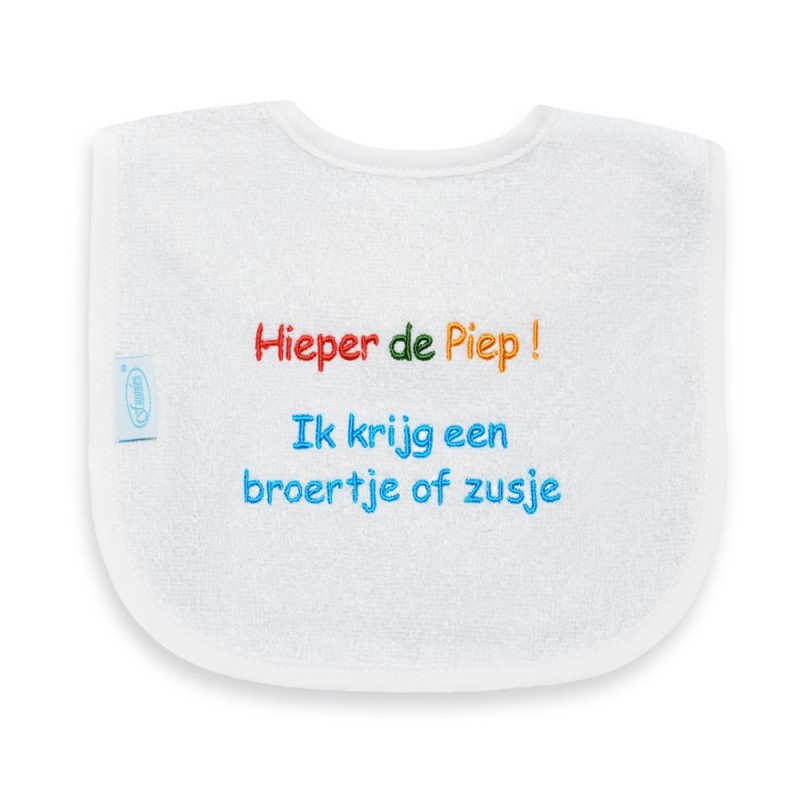 Ecru slab met de tekst "Hieper de Piep! Ik krijg een broertje of zusje" in diverse kleuren geborduurd.