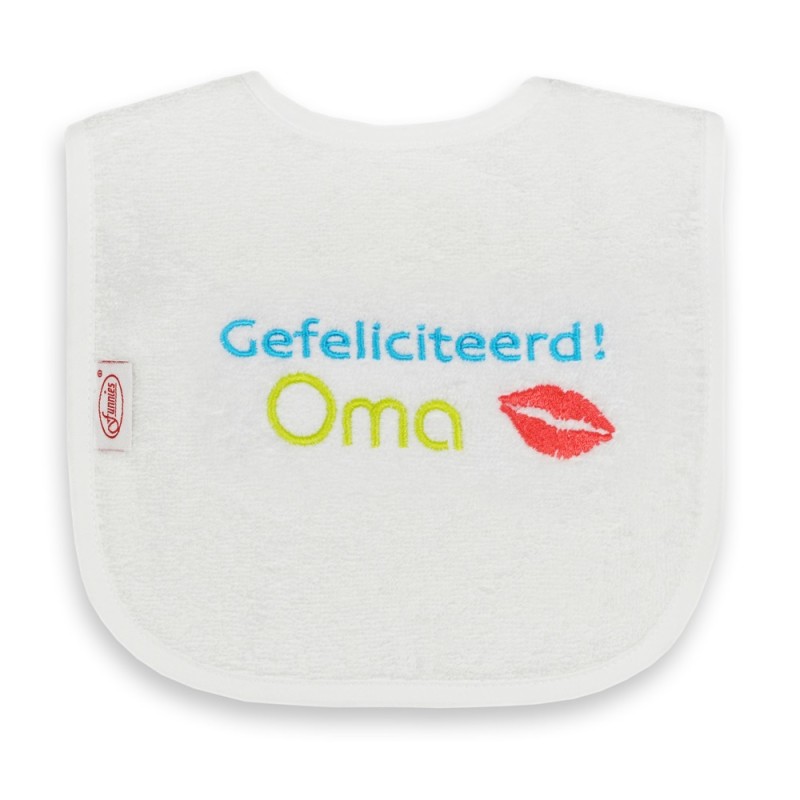 Witte slab met de tekst Gefeliciteerd Oma in verschillende kleuren geborduurd.