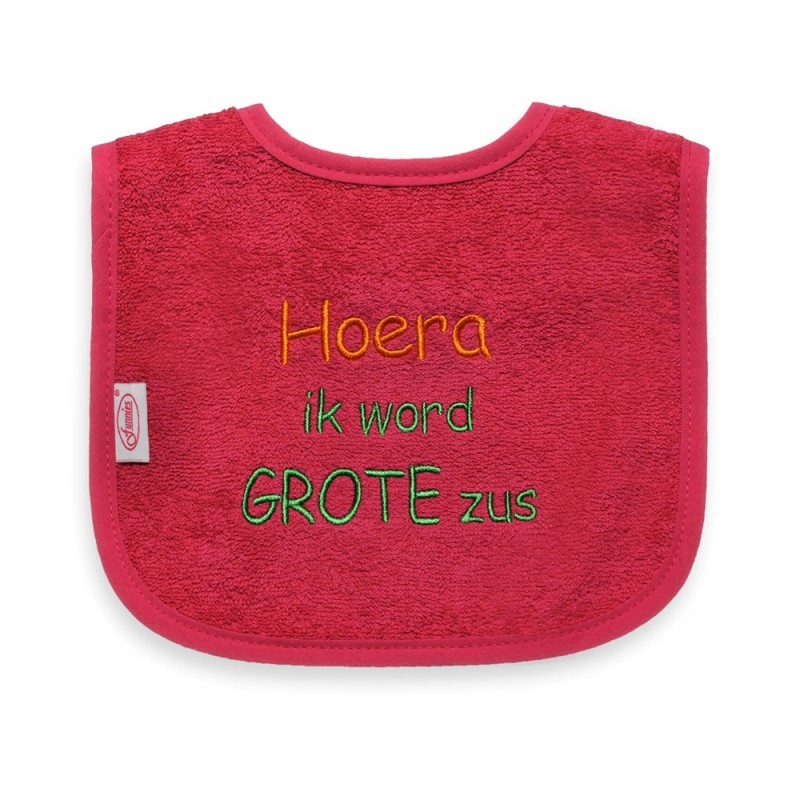 Fuchsia slab met de tekst "Hoera ik word GROTE zus" in oranje en groen geborduurd.