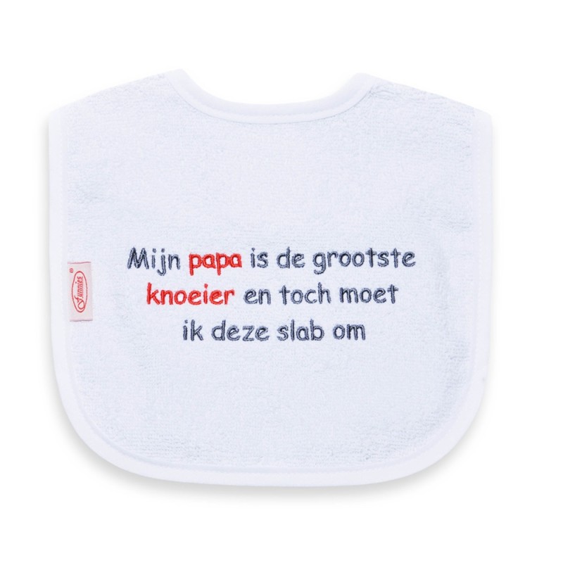 Witte slab met de tekst "Mijn papa is de grootste knoeier en toch moet ik deze slab om" in grijs en rood geborduurd.