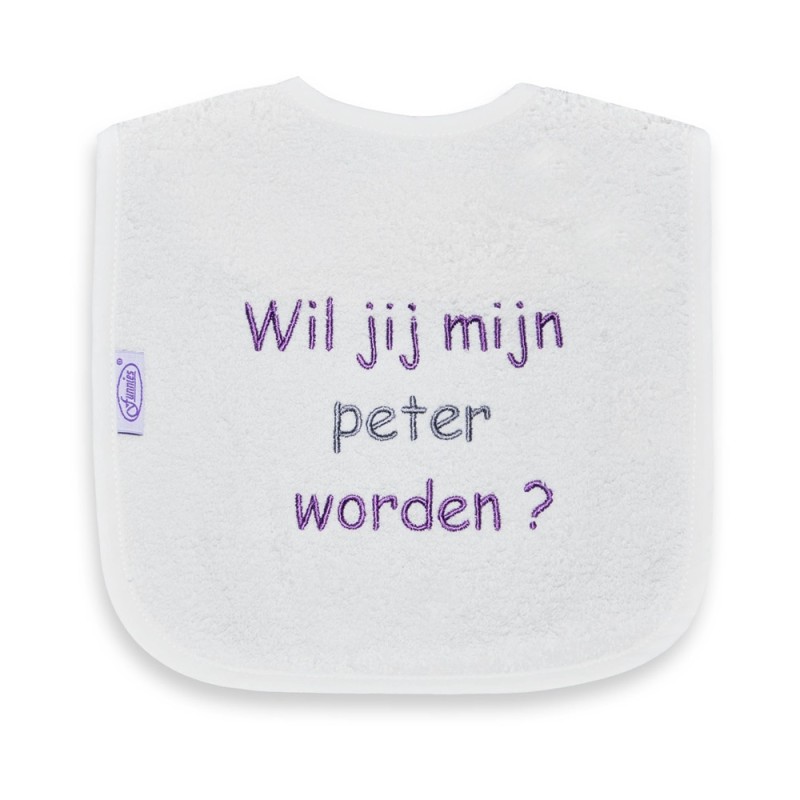 Ecru slab met de tekst "Wil jij mijn peter worden" in paars en grijs geborduurd.