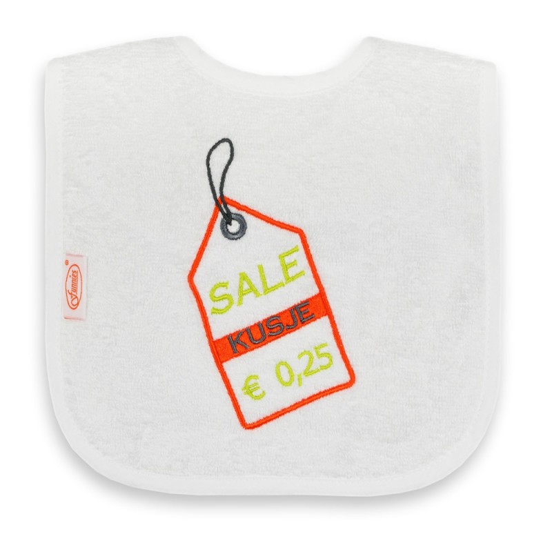 Witte slab met de tekst Sale kusje € 0.25 in verschillende kleuren geborduurd.